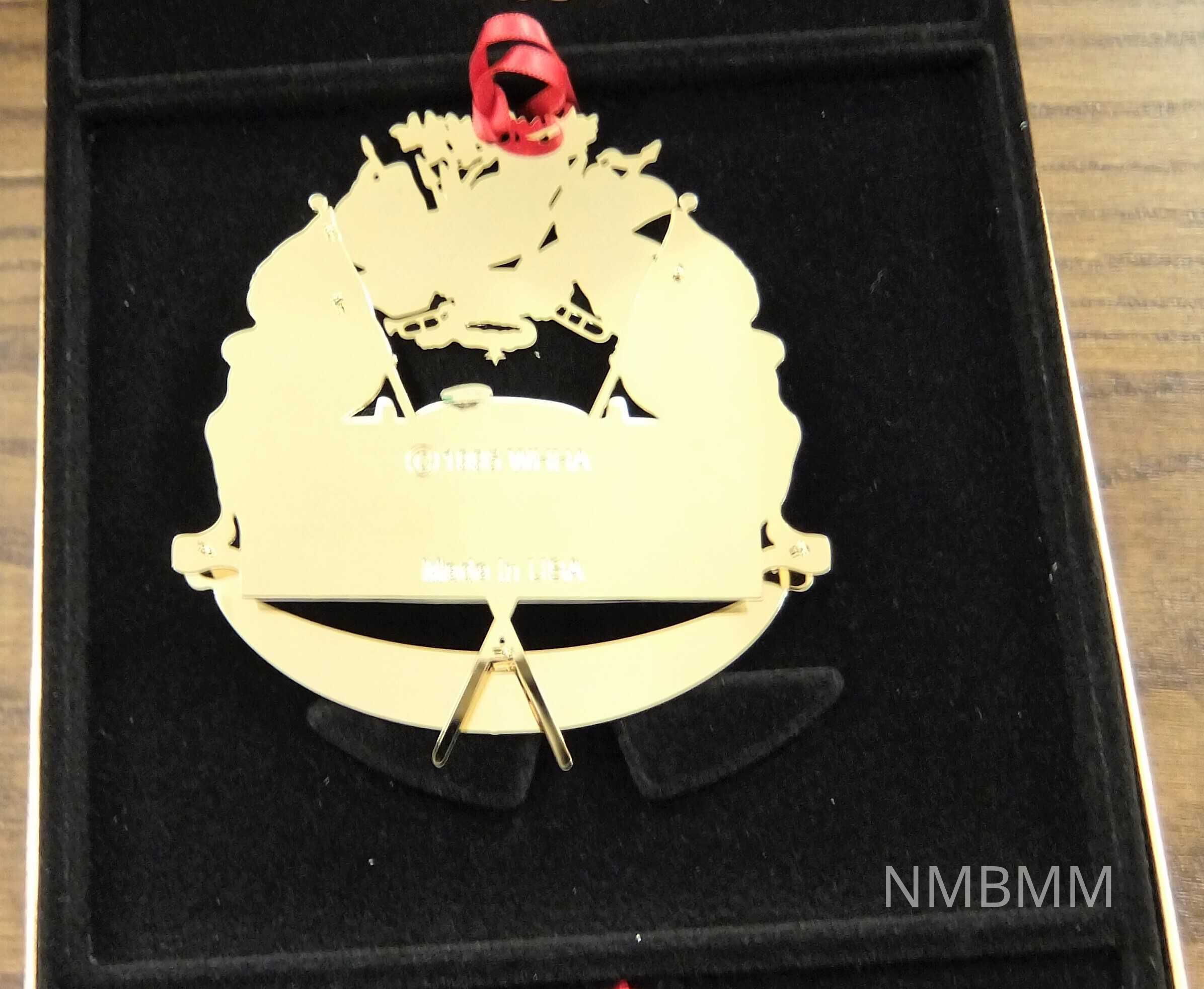 The ornament is in a gold box with a black velveteen liner. The lid of the box has an images of the 1994-1997 ornaments along with the words "White House Historical Association Ornament Set Collection" at the top of the lid. The bottom of the box is plain green, with a small white bar code sticker near the bottom and the words "Visit www.whitehousehistory.org" in white under the sticker.Collection