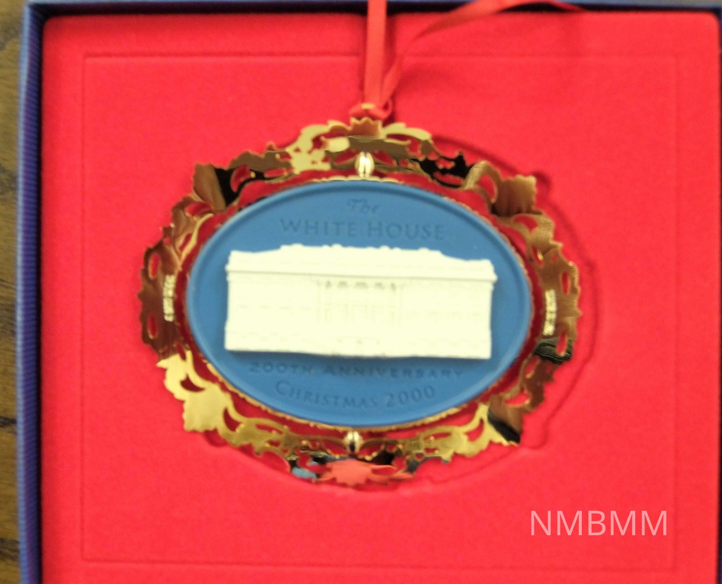 The ornament is in a white box with a blue sash and an image of the White House in the center. The box has a red velveteen liner. The lid of the box has an image of the ornament along with the words "Christmas 2000 The White House Historical Association 200th Anniversary Ronament 1800-2000" in white lettering in the center of the lid. The bottom of the box is plain navy blue, with a small white bar code sticker near the bottom and the words "Visit www.whitehousehistory.org" in white under the sticker.Collection