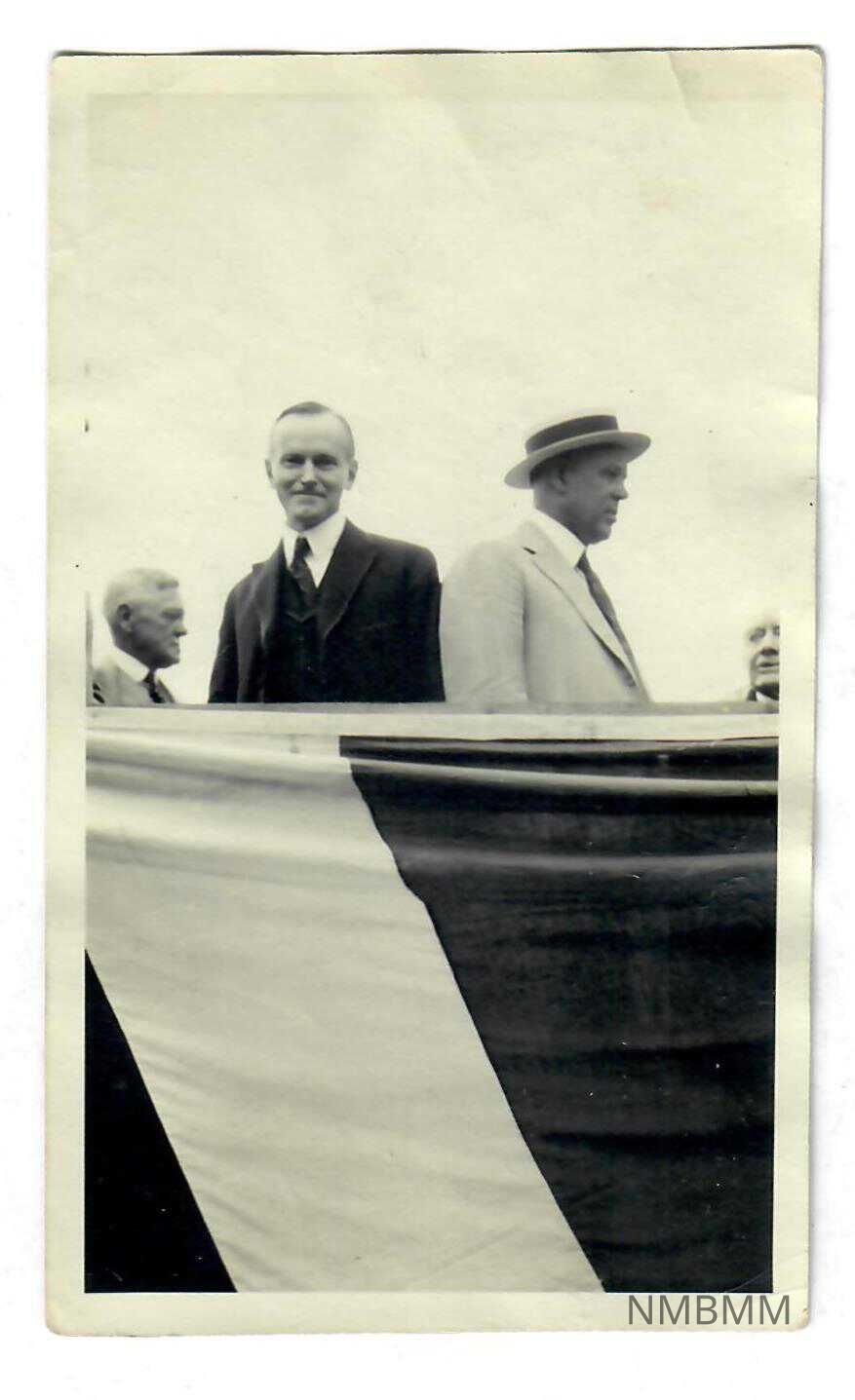 Photograph of Vice President Coolidge taken in 1921 by James A. Kreitler at the dedication of the bust of President Warren G. Harding at the National McKinley Birthplace Memorial in Niles, Ohio. As stated in the letter (1995.01.359), three of the men in the photograph are: Vice President Calvin Coolidge, Niles Mayor Crowe, and Joseph G. Butler. On the back, hand written in ink are the words "Vice President Calvin Coolidge take [?] Niles, Ohio in [1921] at McKinley [Memorial] by JAKreitler." The back aslo has residue remaining from where it was glued to a board.