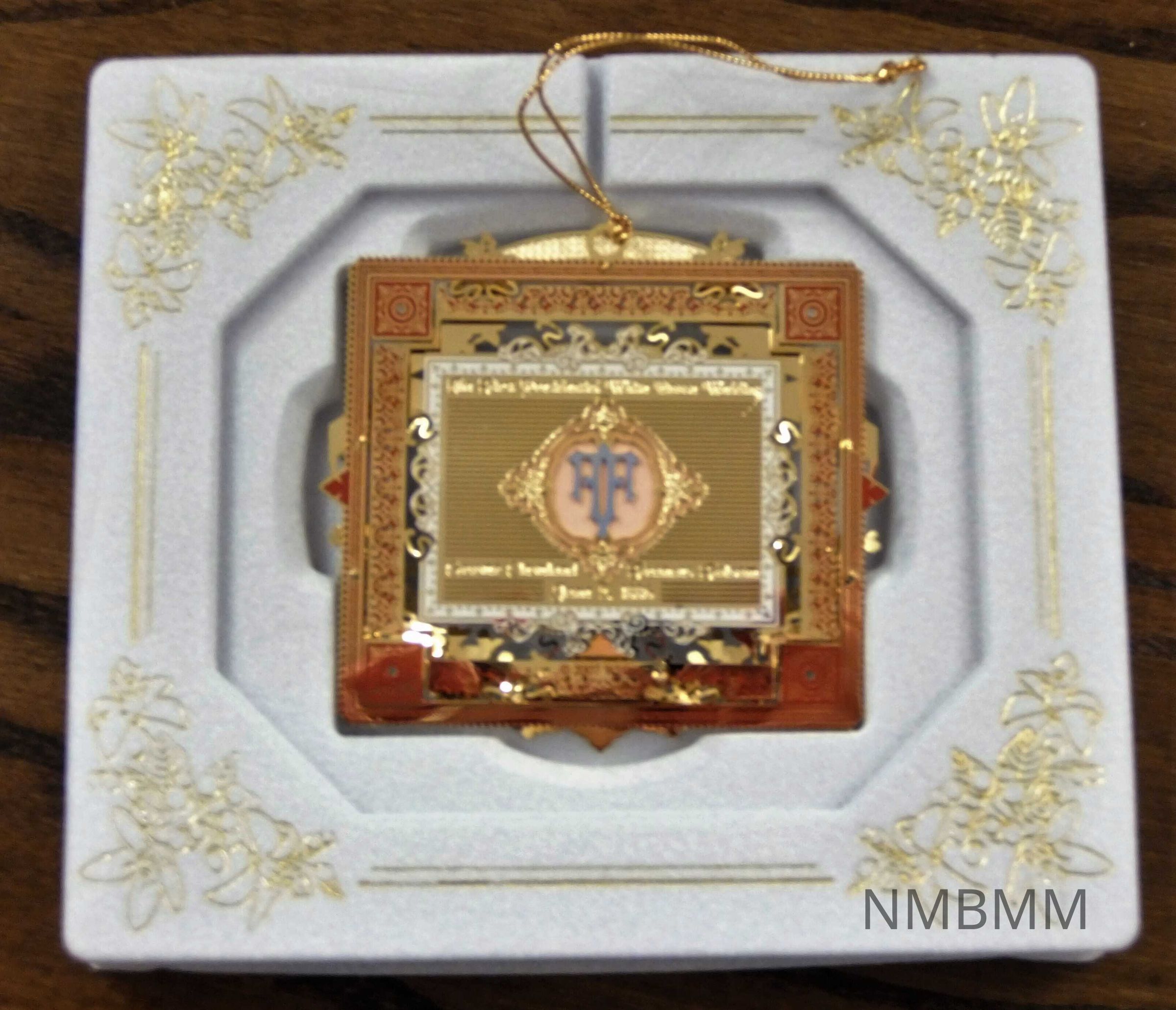 This ornament is part of the White House Historical Association's series of collectible ornaments. It is the twenty-fifth in the series. The ornament commemorates the first administration of Grover Cleveland, the only President to serve two non-consecutive terms and also the only President to get married in the White House. According to the insert booklet, "the historic event [wedding] os the focus of the 2006 ornament. The central illustration is a tinted reporduction of an engraving that originally appeared in 'Frank Leslie's Illustrated Magazine' depicting the bride and groom taking their vows. The gold-plated frame surrounding the engraving showcases design elements from the Clevelands' wedding certificate album. The groom's monogram, which anchors a decorative border incorporating orange blossoms from Frances Folsoms wedding gown, is incorporated on the front of the ornament, which the bride's monogram is featured on the back. The original ornament was on the tree in the Blue Room of the White House during the 2007 Christmas season. A gold cord for hanging the ornament is attached.
