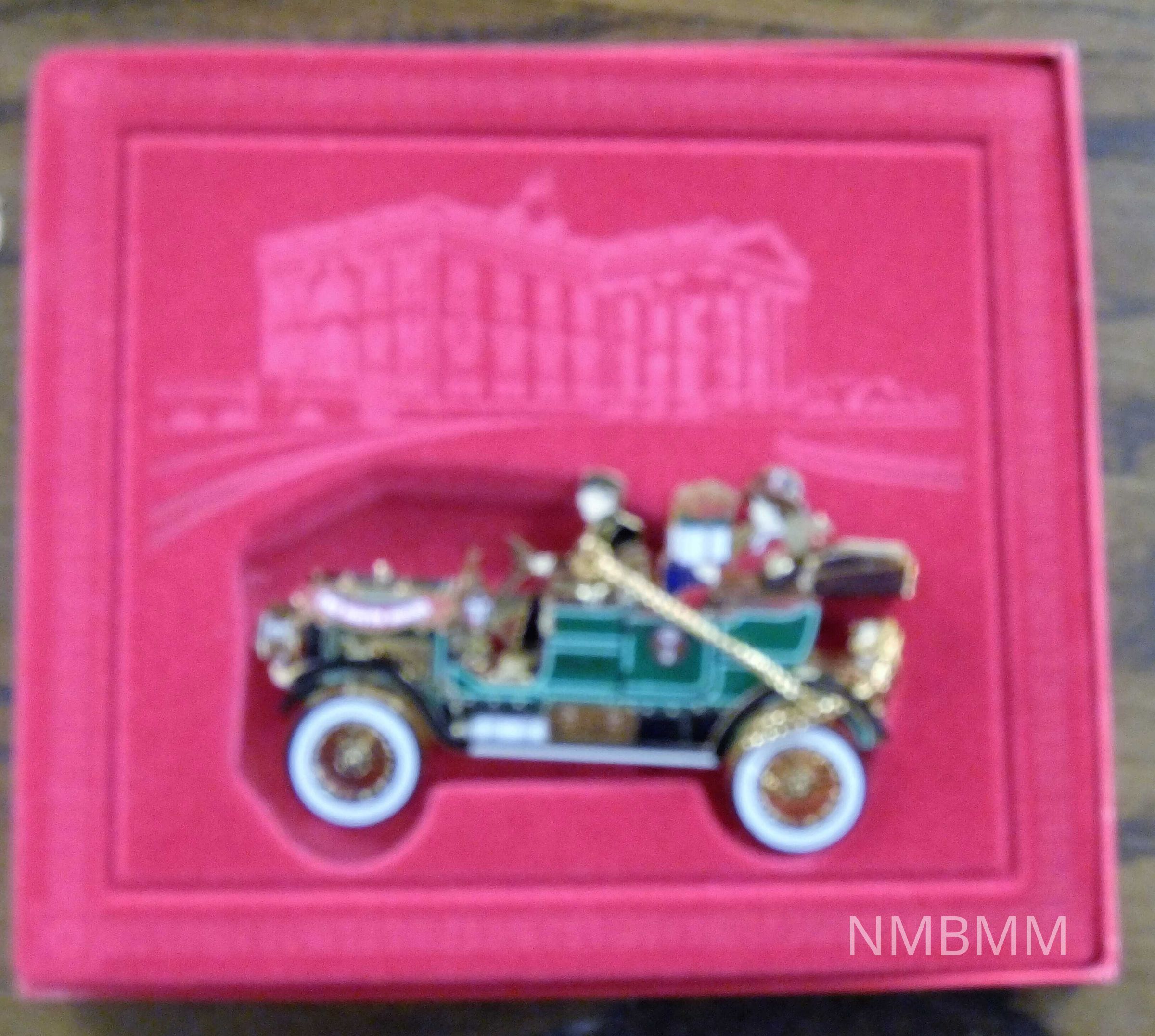 This ornament is part of the White House Historical Association's series of collectible ornaments. It is the twenty-eighth in the series. The ornament commemorates the administration of William Howard Taft. According to the insert, "A distinguished jurist and effective administrator, President Taft focused on executing the law rather than setting an ambitious legislative agenda during his term. Newsworthy for his large size in his own time and remembered today as our heaviest President, he was 6 feet tall and weighed up to 335 pounds. Stories of his famous bathtub, which could hold four men of ordinary size, and his giant 17-hand saddle horse have become White House lore. William Howard Taft introduced the automobile to White House transportation in 1909, breaking a long Presidential tradition of reliance on horse-drawn vehicles. The 2012. White House ornament celebrates President Taft's adoption of the automobile, his love of manufacture and invention, and his ready acceptance of modernity. The ornament depicts President and Mrs. Taft enroute to deliver Christmas presents. They are seated behind chauffeur George H. Robinson in the White Motor Company's Model M, a seven passenger steam-powered touring car embellished with Great Seal of the United States on the doors. The color, as described at the time, is 'a harmonious blend of subdued greens.' The ornament is made in the United States of highly-polished brass with a coating of nickel finished in 24K gold." The original ornament was on the tree in the Blue Room of the White House during the 2012 Christmas season. A gold cord for hanging the ornament is attached.