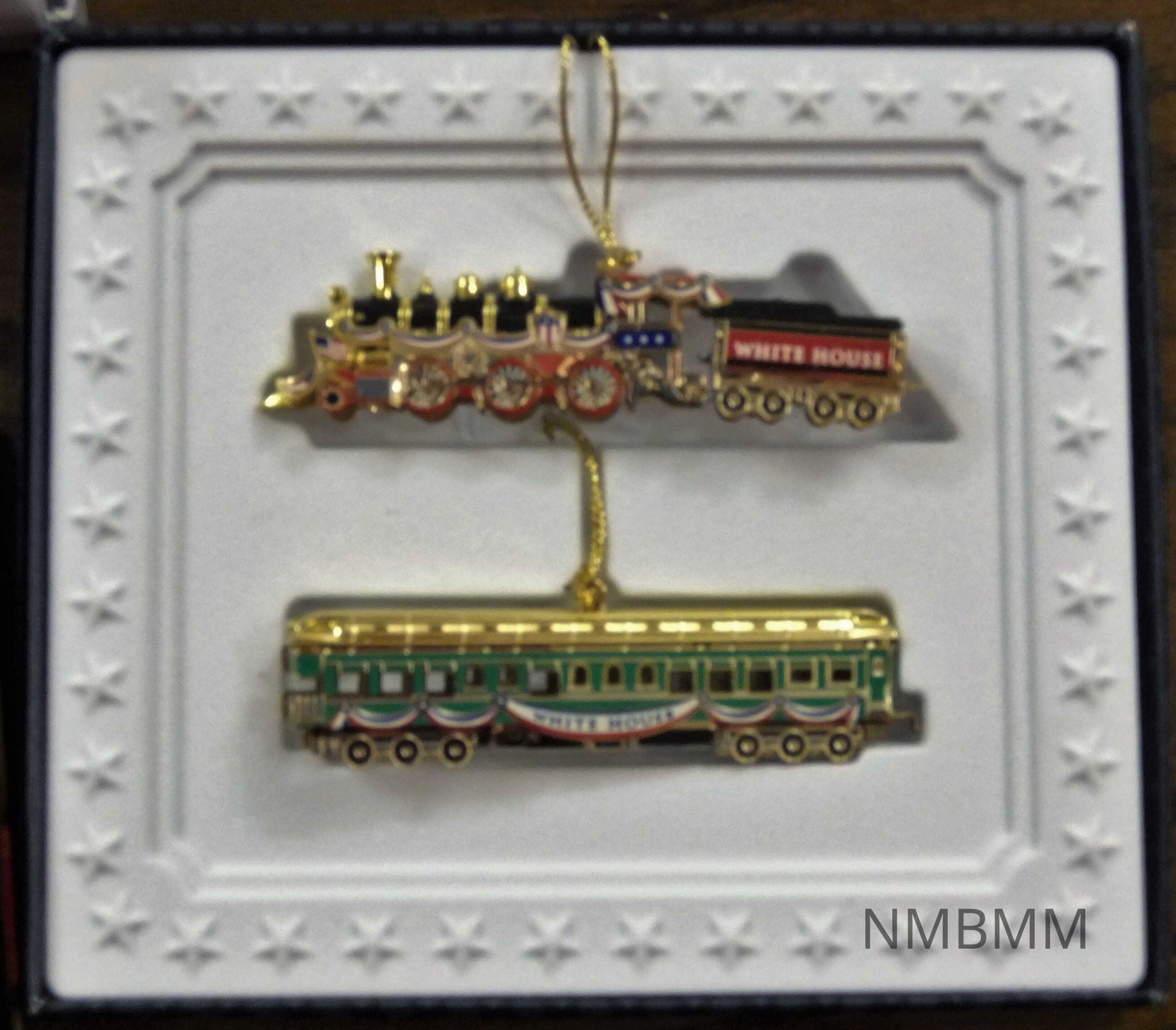 This ornament is part of the White House Historical Association's series of collectible ornaments. It is the thirtieth in the series. The ornament commemorates the administration of Warren Harding. According to the insert, "Decorated with gold tones and enamel finishes, the 34th annual White House Christmas Ornament is our first ornament to be comprised of two pieces, which can be hung as two separate ornaments or linked together. The locomotive is a detailed miniature replica of one of several steam-powered locomotives that pulled the Presidential Special; it is attached to the tender (a coal car that also carried water). The other miniature car is the 'Superb,' the President's private heavyweight Pullman car. The last car on the Special, the 'Superb' was outfitted with a public address system. President Harding made appearances and delivered speeches at stops across the country from a platform at the back of the car. The last known photograph of President Harding is an image of him on the 'Superb' shortly before his death in a San Francisco hotel on August 2, 1923. On August 3, President Harding's casket was placed on board the 'Superb' and began a return trip to Washington, D.C., during which an estimated three million people paid their last respects." The original ornament was on the tree in the Blue Room of the White House during the 2014 Christmas season. A red satin ribbon for hanging the ornament is attached. Decorated with gold tones and enamel finishes,