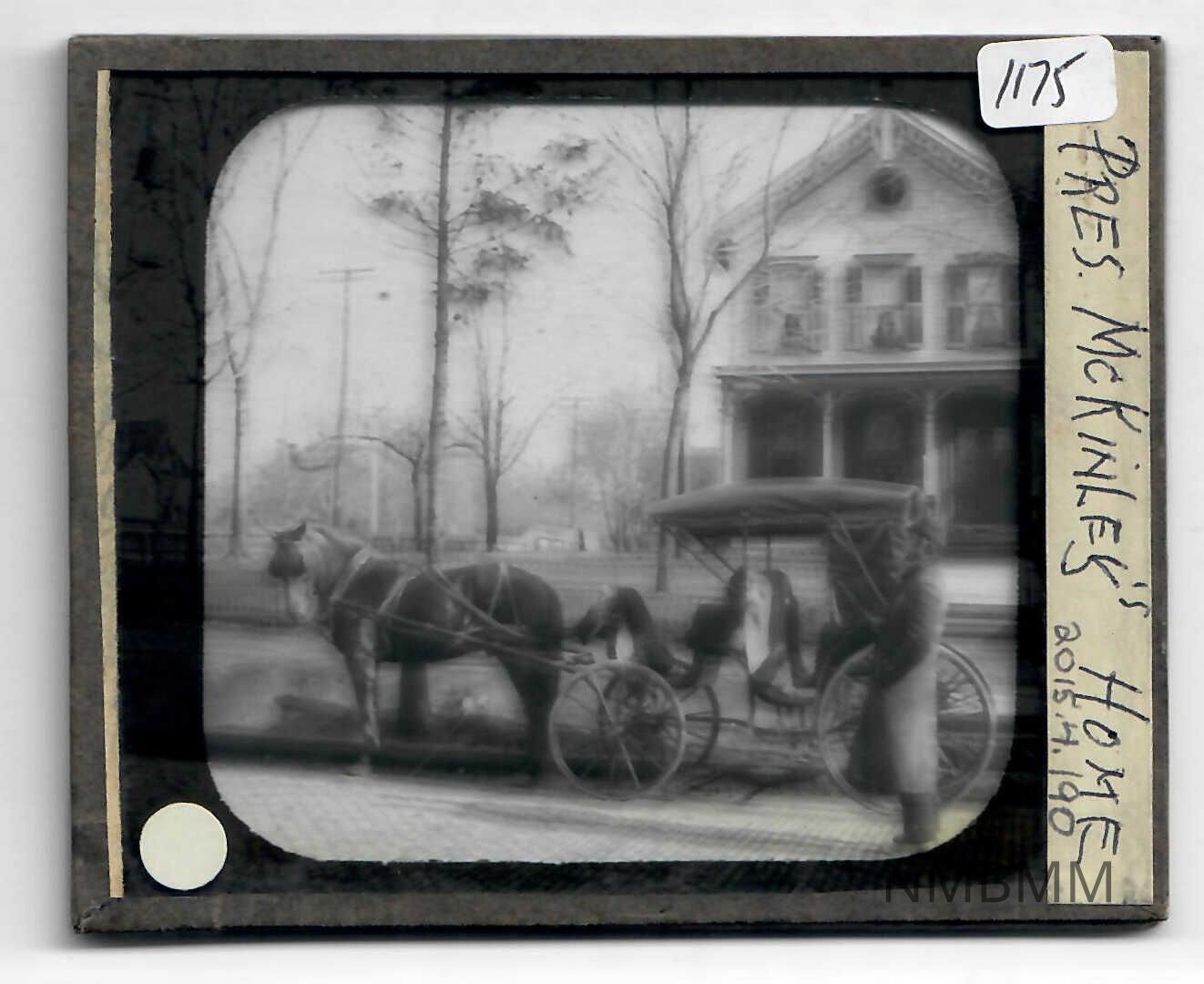 This glass lantern slide shows a horse and carriage in front of the McKinley Campaign home in Canton, Ohio. The front features a sticker on the right side on which the title has been hand lettered. The back shows the reverse of the slide. The lantern slide has its origins in 17th century optical viewing devices which came to be known as “magic lanterns.” The earliest slides for magic lanterns consisted of hand-painted images on glass, projected by itinerant showmen telling stories about the images that were projected. They can be recognized by the simple paint areas applied with a brush and the obvious brush strokes. By the difficult term Decalcomania we describe the technique of transferring pictures from specially prepared paper to surfaces such as glass, china, pottery etc. In the world of magic lanterns we specifically mean the application of this process while making a lantern slide by transferring an image to a square or oblong piece of glass. The technique was used by professional slide makers, but enjoyed a vogue among amateurs too. Images were printed in colors by the chromo-litho principle, and then transfered to glass. Porous paper was coated with a solution of starch, albumen and glycerin. The colored pictures were printed, details first, background last, and then finished by a coat of glue. http://www.magiclanternsociety.org/about-magic-lanterns/lantern-slides/