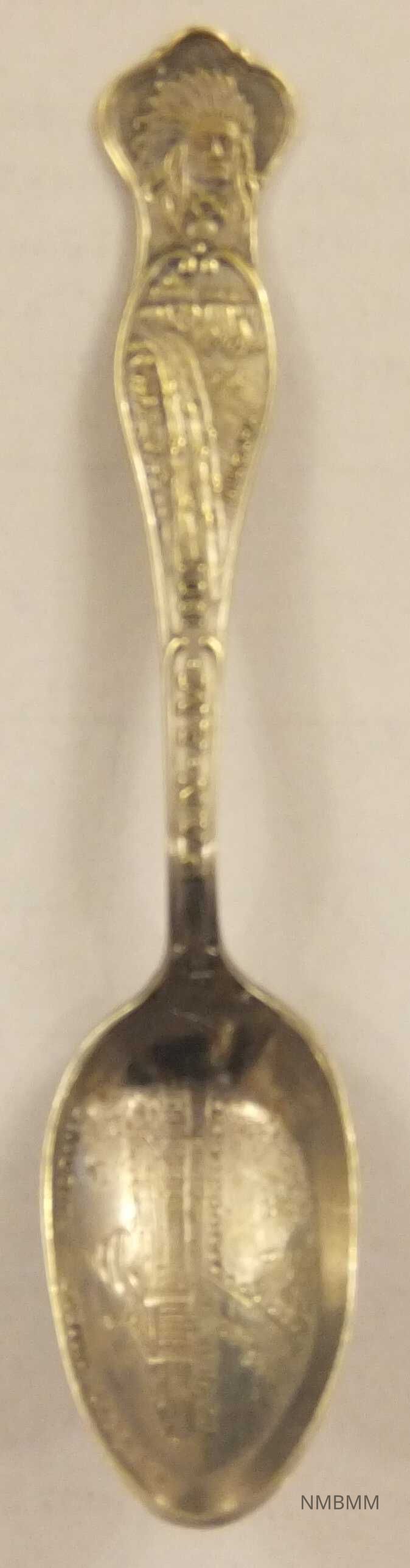 Silver demi-tasse spoon with Government building etched into the bowl; handle is engraved with pictures of Niagara Falls; at the head of the handle is a etching of an Native American chief; the bottom of the handle is engraved with "Pan-Am." The backside of the handle has an image of the Electric Tower (391 feet high) with etched Buffalo (USSC).Collection