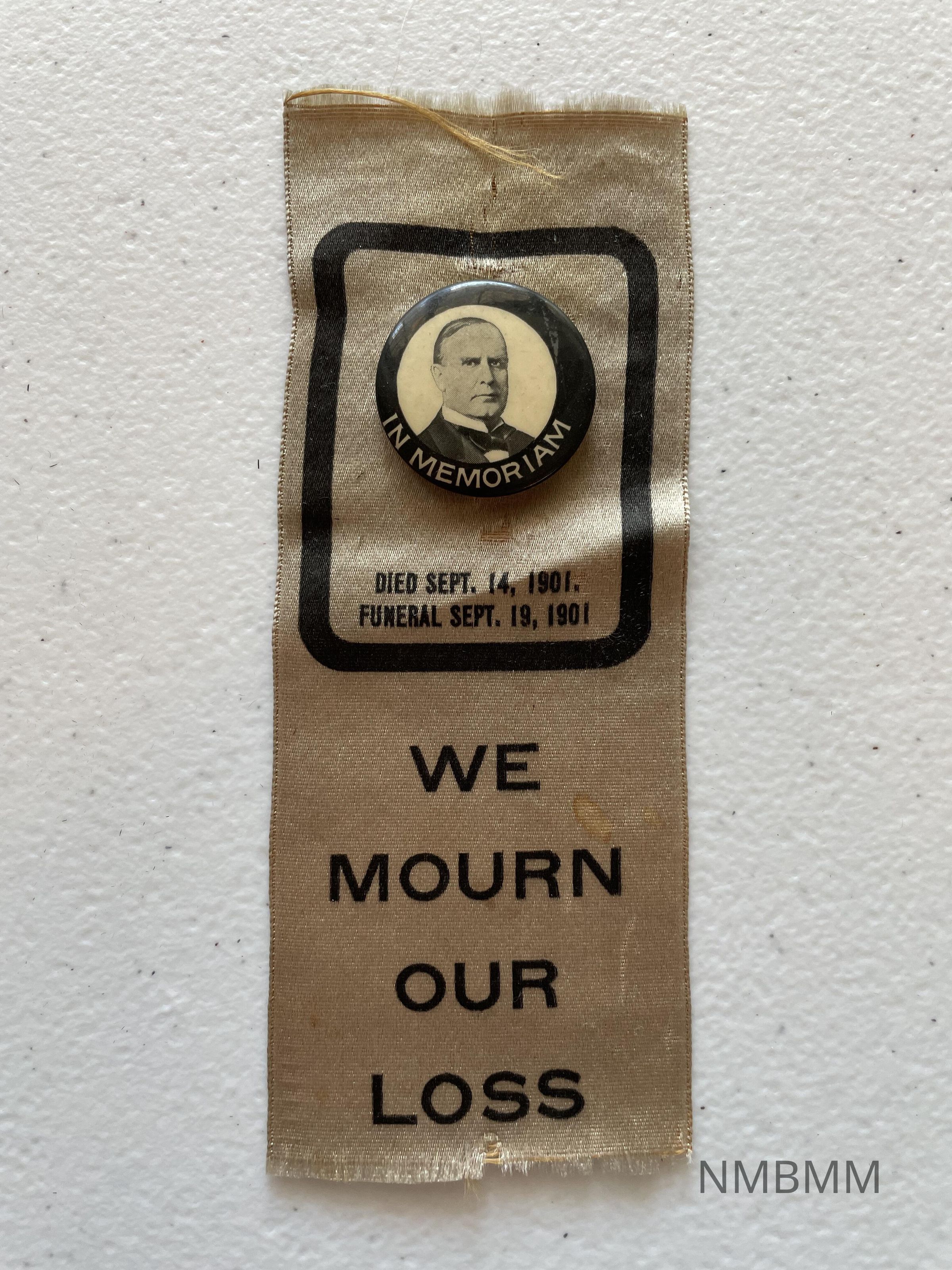 This is a 2 part commemorative ribbon and pin. The pin has a portrait of McKinley with a black border with "In Memoriam" below it. The ribbon reads, "Died Sept. 14, 1901. Funeral Sept. 19, 1901." On the lower portion of the ribbon are words reading "We Mourn Our Loss."Collection