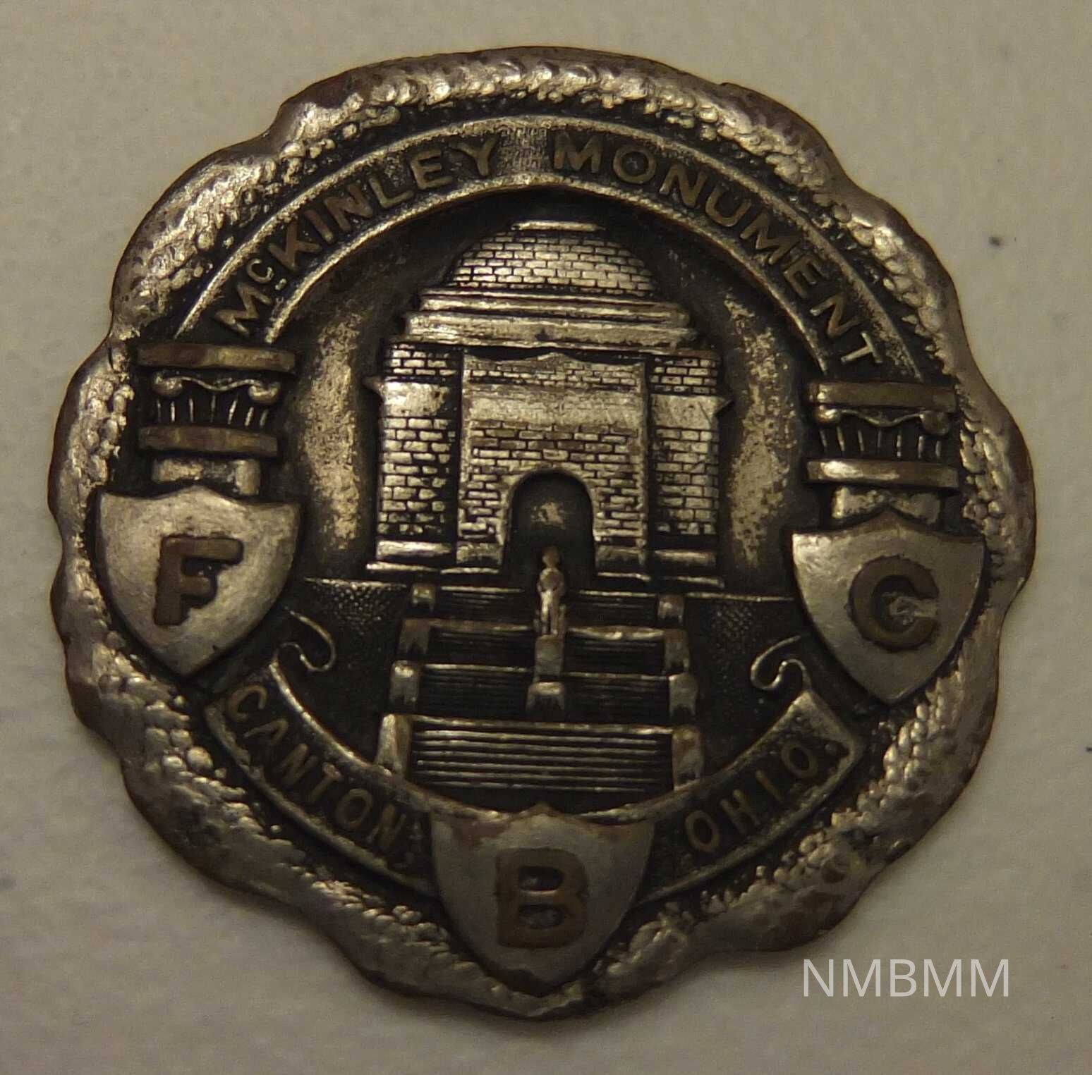 This is a silver round fob measuring 1 1/2 in. in diameter. You can see that the hanger used to attach the fob has been broken off at the top. The front of the fob has the McKinley Monument, located in Canton, Ohio, etched into the metal. Surrounding the Monument is a circular border. Within the border, on either side, is a small column, and arched above are the words reading "McKinley Monument." Below the left column is the letter "F" inside a shield. On the right side is the letter "C" within a shield. In an arch below the Monument are the words reading "Canton, Ohio" with the letter "B" in a shield, in between the words. The letters F, C, B represent the Pythian motto "Freindship, Charity, Benevolence."