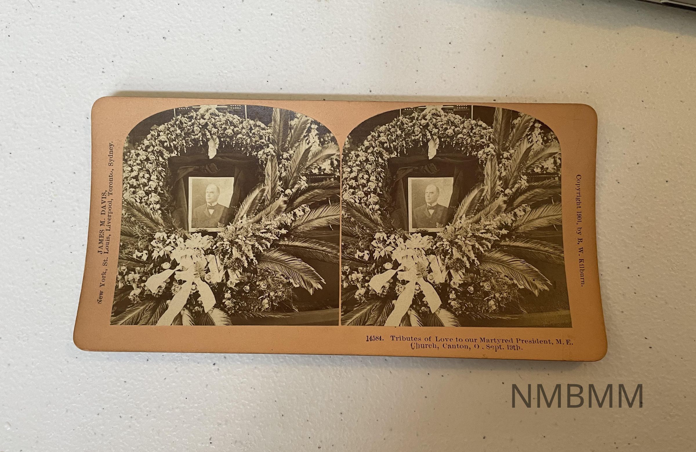 Stereoscopic view of floral tributes to President McKinley at the time of his memorial service at the Methodist-Episcopal Church in Canton, O on September 19, 1901.