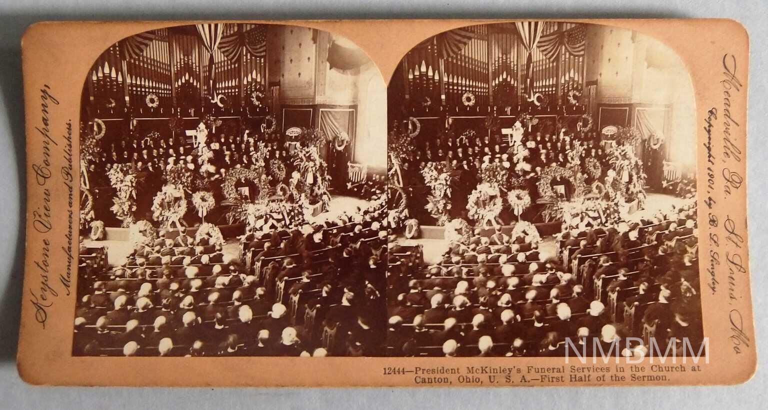 Stereoscopic image of the first half of the sermon during McKinley's funeral in Canton, Ohio September 19, 1901. The front of the card shows the photo.
