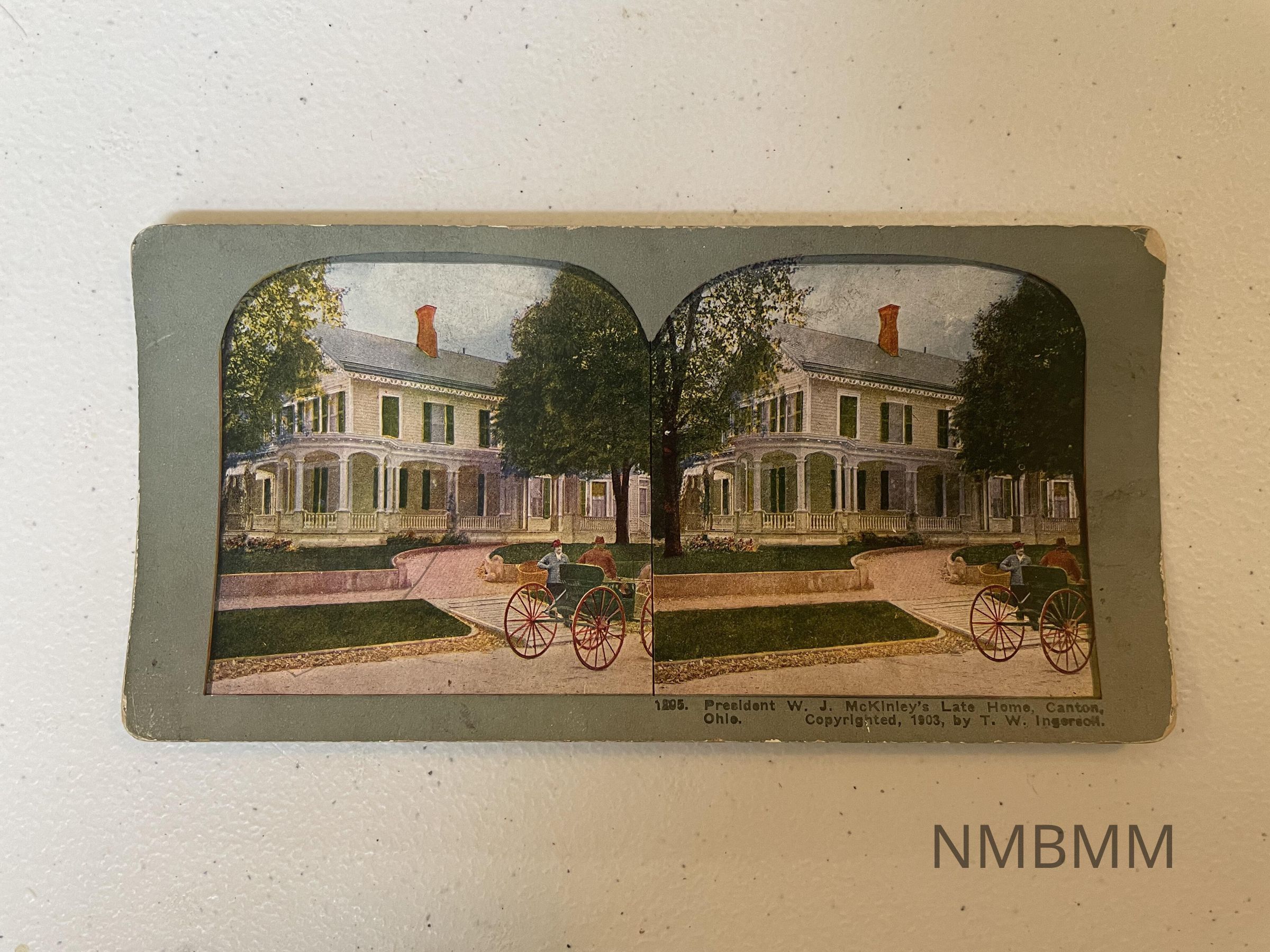 Colored stereoscopic view of the McKinley Campaign home in at 715 Market Avenue North, Canton, Ohio. The view on the front features the McKinley home.