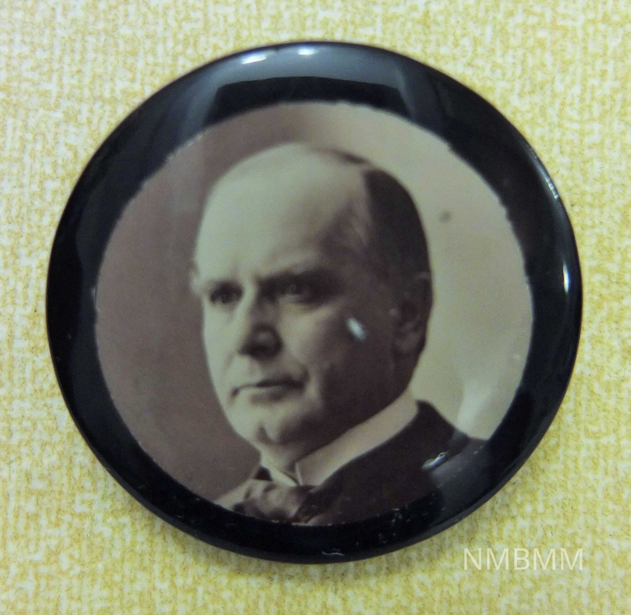 This is a 1 1/2 in. diameter button made of celluloid and metal. The front of the button has a sepia toned portrait of McKinley facing left, and surrounded by a black border. On the reverse side is a metal back with a 1 1/8 in. long metal pin and clasp used for attachment. No manufacturer's markings are visible.Collection