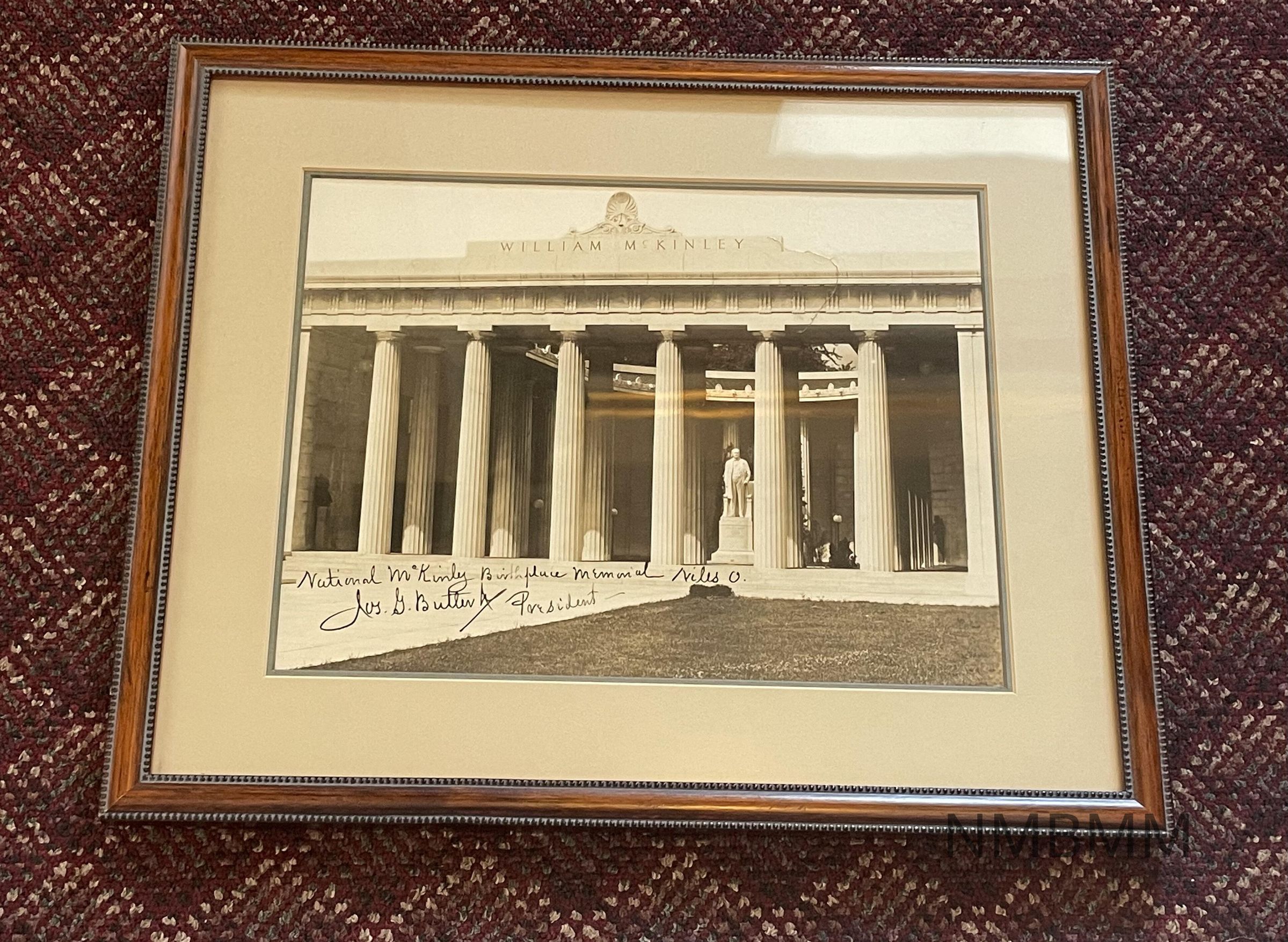 Framed, autographed photo of Court of Honor of the National McKinley Birthplace Memorial in Niles, Ohio. The photo is autographed "National McKinley Birthplace Memorial Niles, O. Joseph G. Butler, Jr." The National McKinley Birthplace Memorial was dedicated in 1917. Its founder was Joseph G. Butler, Jr., a lifelong friend of William McKinley, 25th President of the United States. It was built "to perpetuate the name and achievements of William McKinley Twenty-fifth President of the United States of America Born Jan. 29, 1843 ~ Died Sept. 14, 1901."