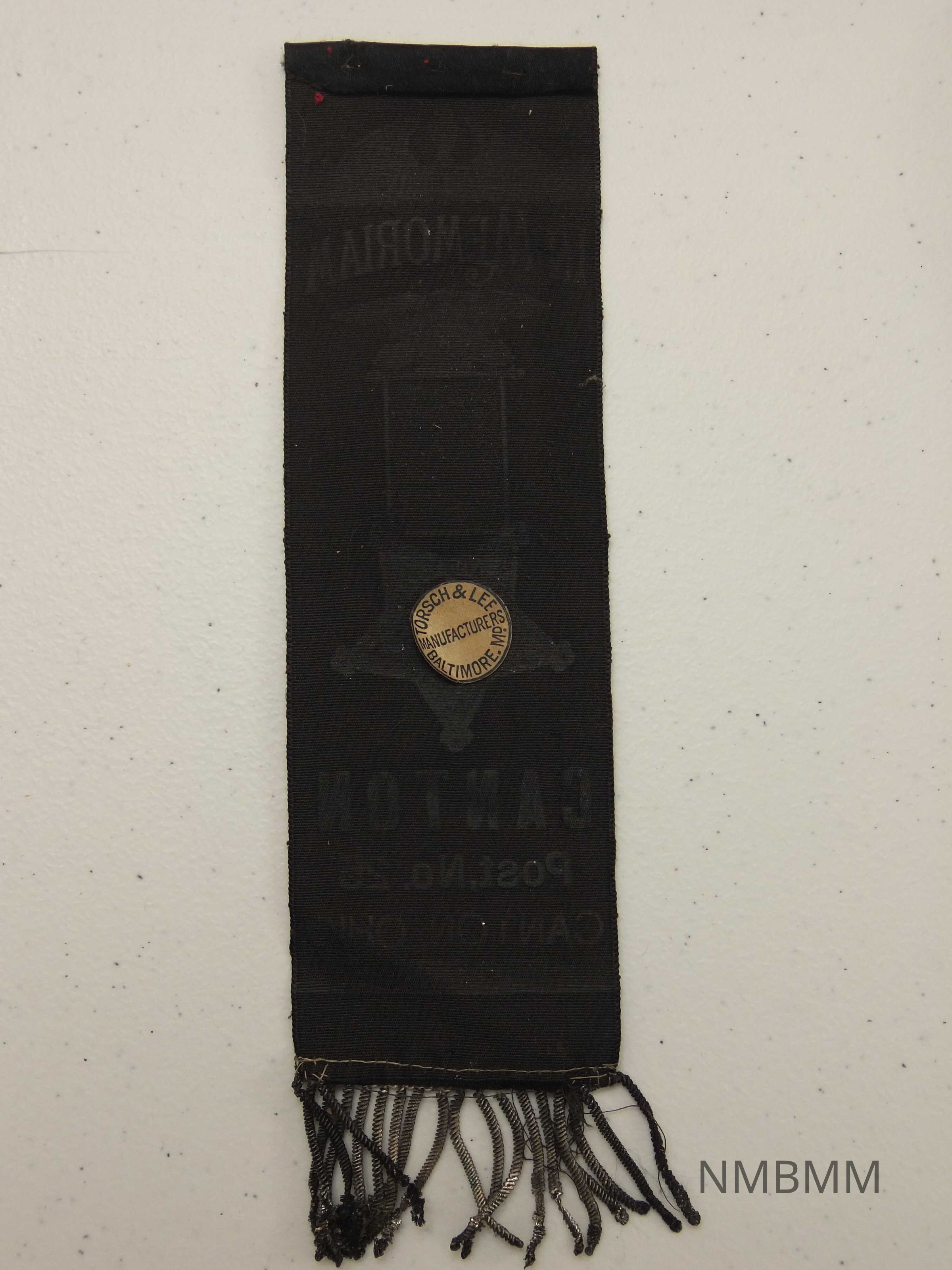 This is a 2 1/2 in. wide x 9 1/4 in. long ribbon made of satin cloth, metal, and paper. At the top of the ribbon in silver is what looks like a tombstone design banner with an urn. "Honor The Noble Dead" are the words written in black across the banner. Below this are written words that read in silver "In Memoriam." Next, on the ribbon is an eagle with wings spread standing atop crossed cannon barrels, all in silver. A silver rectangle with a cloth American Flag hangs from a silver rod. The flag contains 13 white stars on a blue background, 7 red stripes, and 6 white stripes. A 5 pointed silver star is connected to the rectangle. Each point has a small star in it, with a different symbol on it, from right to left; 2 swords with the tips touching, muskets with bayonets, crossed cannons, a bugle, and an anchor. The face of the star is described in detail in the article below, although this is not a metal piece but cloth.