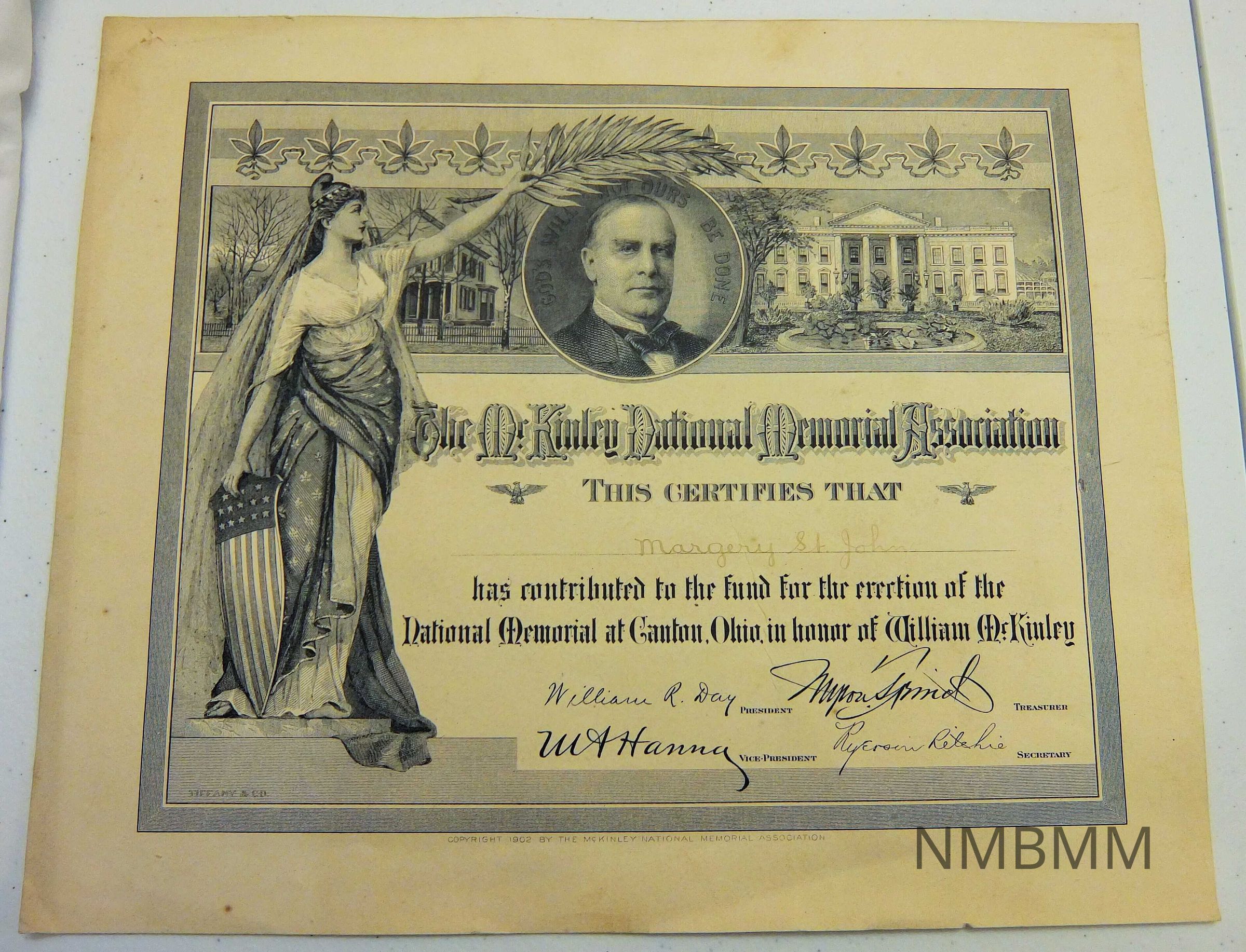 "Tiffany & Co." is located in the lower left corner of the certificate. Beneath the bottom of the border is written the words "Copyright 1902 By The McKinley National Memorial Association.