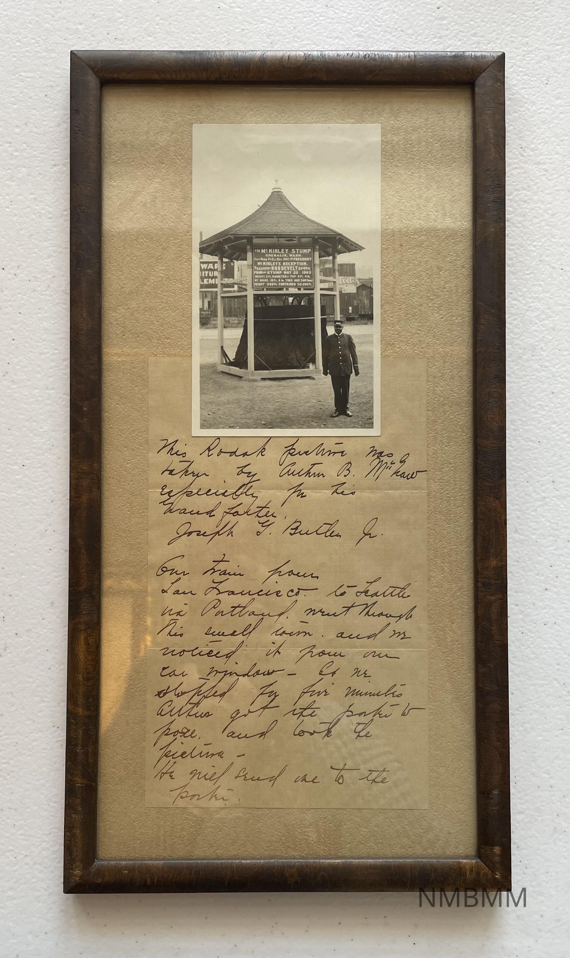 Photograph of the McKinley Tree Stump in Chehallis, Washington. The photo shows the train conductor standing next to the stump, which is enclosed in a wooden gazebo-like structure. The sign in the photograph indicates that McKinley and Roosevelt made a speech while sitting on this stump (hence the term "stump speech"). The following description/provenance is handwritten on the mat: "This Kodak picture was taken by Arthur B. McThaw especially for his grandfather Joseph G. Butler, Jr. Our train from San Francisco to Seattle via Portland went through this small town and we noticed it from our car window. So we stopped for five minutes. Arthur got the porter to pose and took the picture. He will send one to the porter."