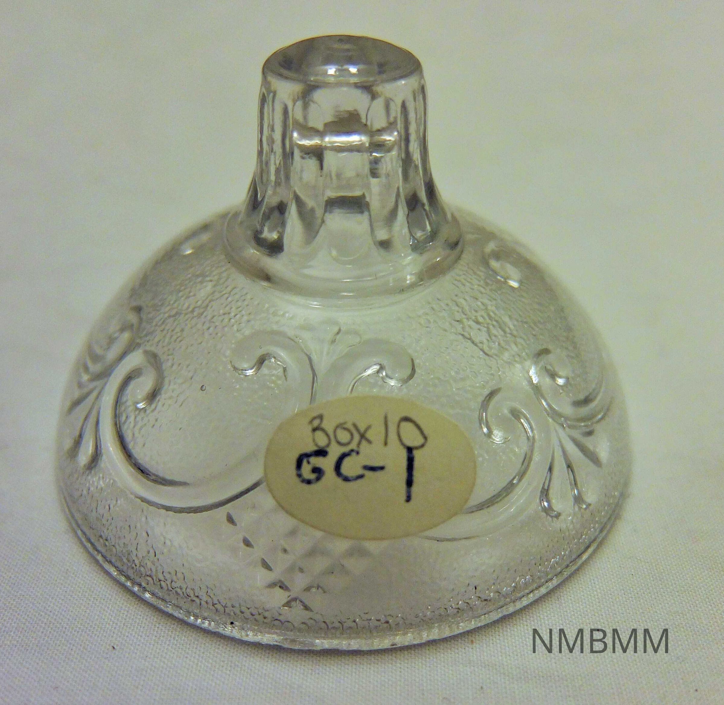 This is a glass lid for a sugar bowl, 2 3/4 in. in diameter and 2 in. in height. There is a decorative pattern on it like a fleur di lis, and it has a small knob on the top to be able to lift it from the container. The interior is textured giving it a slightly frosted appearance.Collection