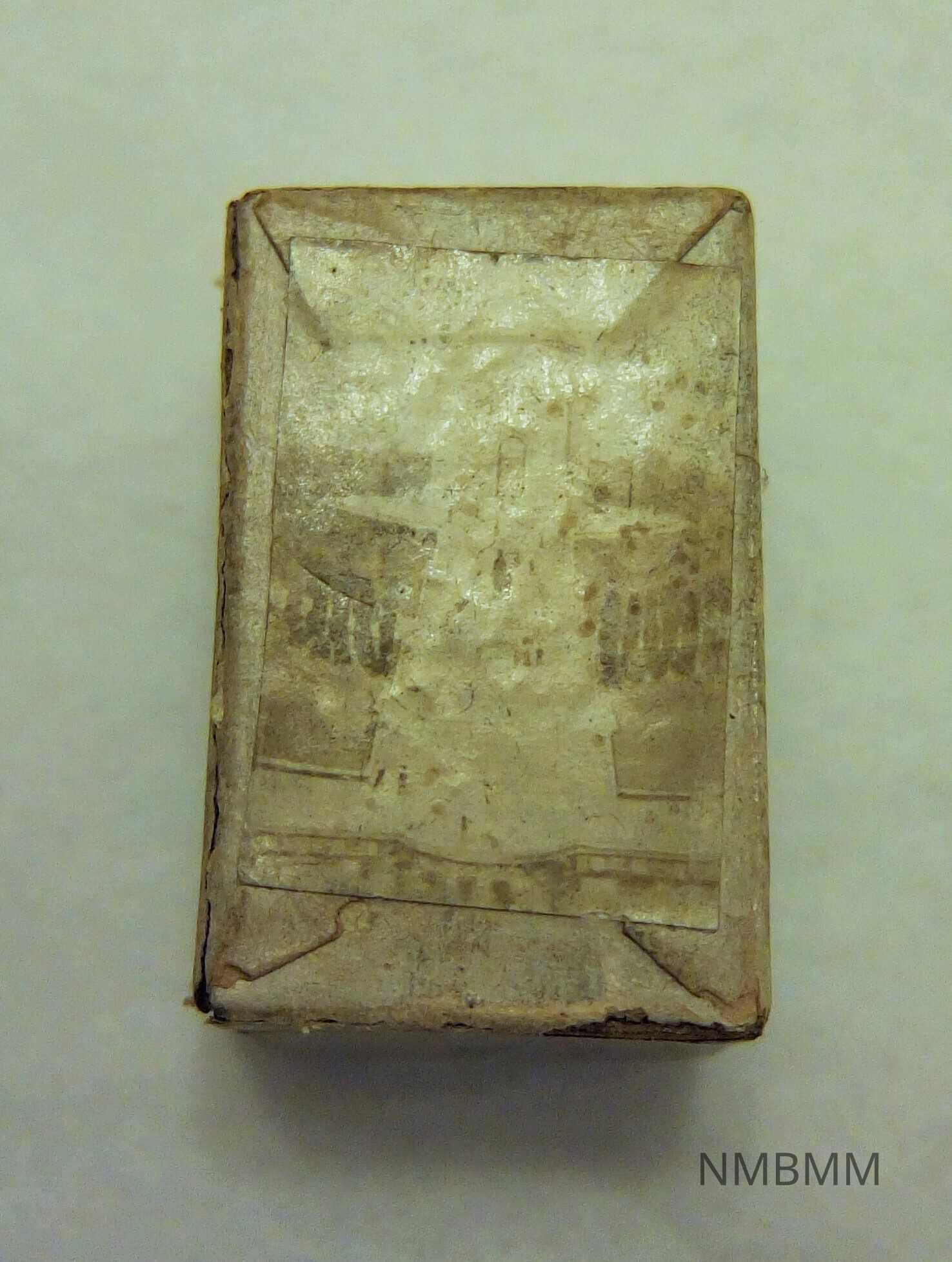 This is a small commemorative box used to store a piece of granite from the McKinley Monument in Canton, Ohio. The box measures 1" wide x 1 1/2" tall x 3/4" deep and is made of paper. The outside of the box has a picture of the McKinley Monument adhered to the front. The bottom of the box has the old library number "95.70.148.1" and the letters "L. McK" hand written. The interior of the lid has a photograph of McKinley glued to the inside. The interior of the bottom is plain and contains a piece of granite but lacks the cotton batting which would have protected it. The granite is an irregular shape measuring 1 1/4" in length, and is multicolored in shades of white, black, gray, and beige, and sparkles due to the content of material from which it is made.