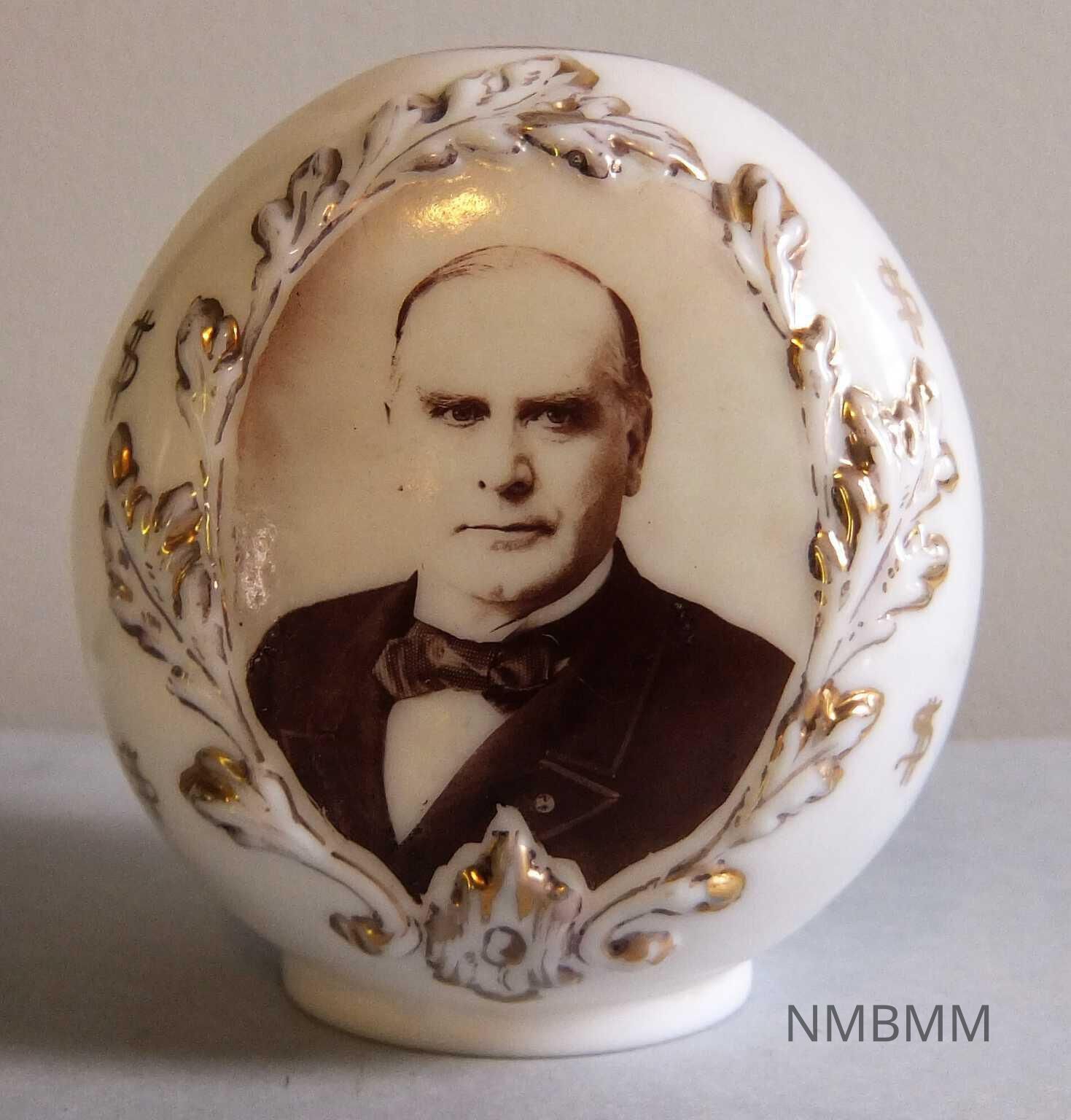 Oval porcelain egg with McKinley on the front. The sides and back of the egg feature gold dollar signs, 1896.Acquisition