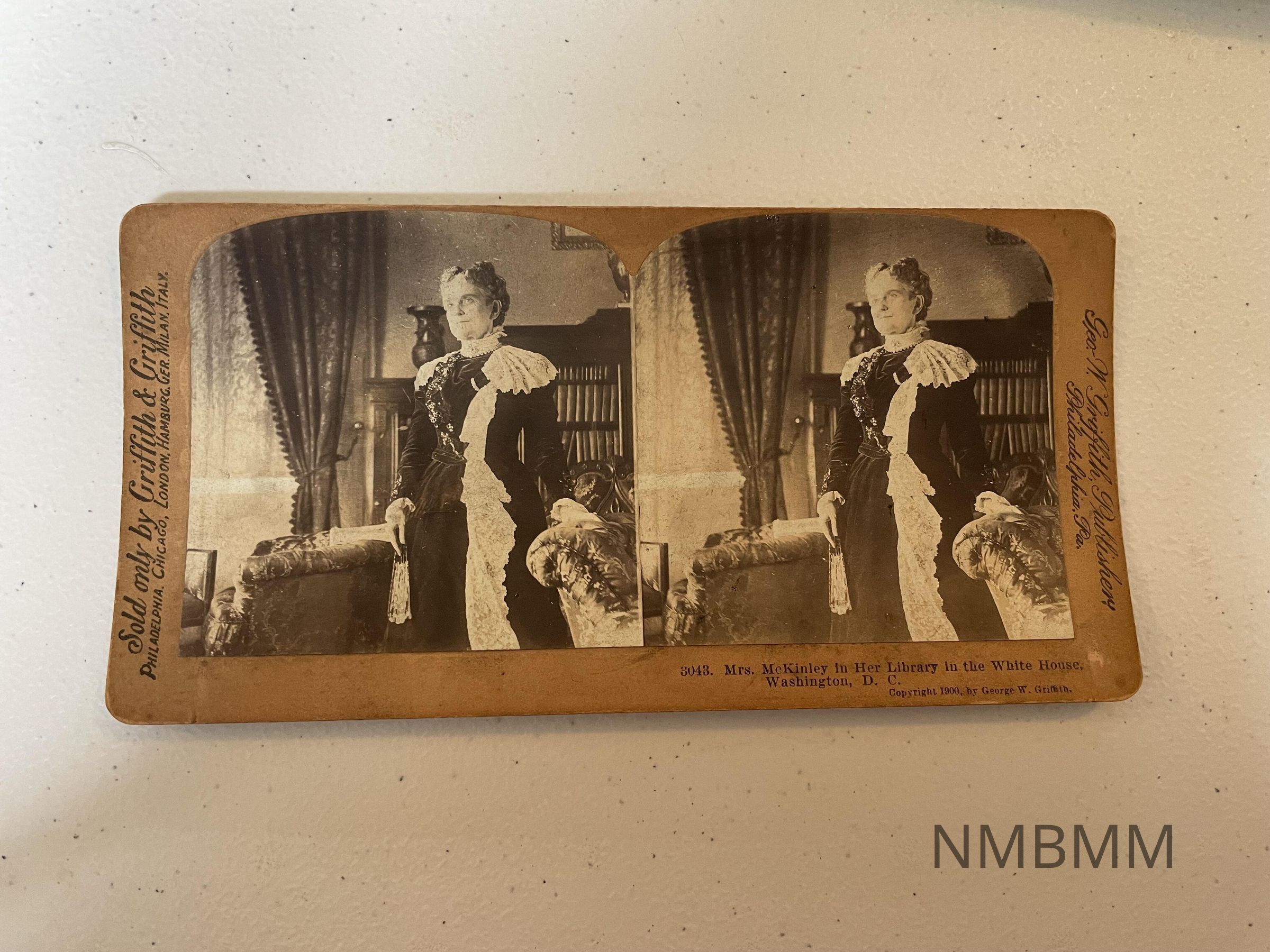 Stereoscope view of Mrs. McKinley in her Library in the White House, Washington, D.C. The caption under the right photo reads: "Mrs. McKinley in her Library in the White House, Washington, D.C. Copyright, 1900 by George W. Griffith." Maker's mark on the left side of the card reads "sold only by Griffith & Griffith Philadelphia Chicago London Hamburg Ger. Milan Italy." Maker's mark on the right of the card reads "Geo. W. Griffith, Publisher Philadelphia, Pa."