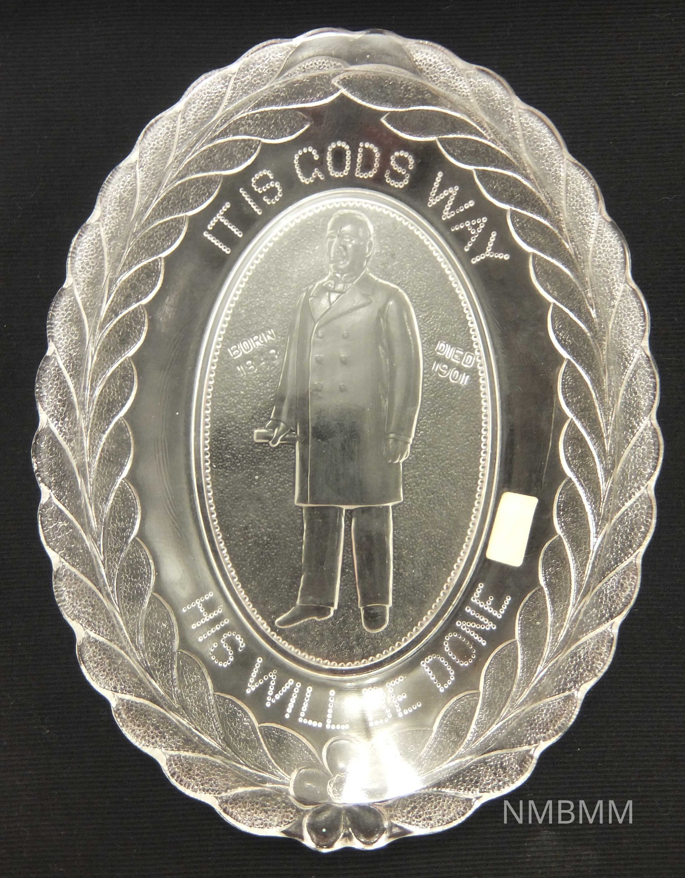 Clear pressed glass oval platter with scalloped edge. Leafy laurel wreath along the edge. Lettering on the side reads, "It Is God's Way / His Will Be Done." The bottom of the platter shows a full-length portrait of a man wearing an overcoat and holding a scroll (William McKinley (1843-1901)). Lettering at the sides of the portrait reads, "Born 1843 / Died 1901." * *