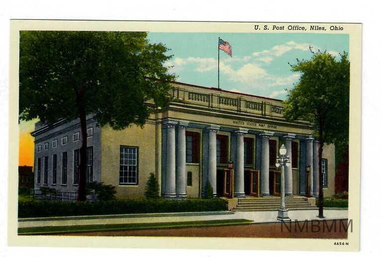 Color reproduction of a postcard featuring an image of the United States Post Office in Niles, Ohio. This post office is located on W. Park Avenue, and was constructed by the Works Progress Administration in the 1930s. The image is framed in off-white, with the text "U. S. Post Office, Niles, Ohio" printed on the top right corner. The text "4A54-N" is printed at the lower right corner. The back of the card is unused, and features black printing on an off-white background. There is no caption on the top left; however The words "Youngstown News Agency, Youngstown, Ohio" are along the left side, written vertically. The middle of the card contains the words "Genuine Curteich-Chicago 'C.T. American Art' Post Card (Reg. U.S. Pat. Off.)" vertically printed. The upper right corner of the card has a 0.75 inch x 0.75 inch square with the words "Place Stamp Here" printed within it. The words "Post Card" are printed just to the left and below the square.