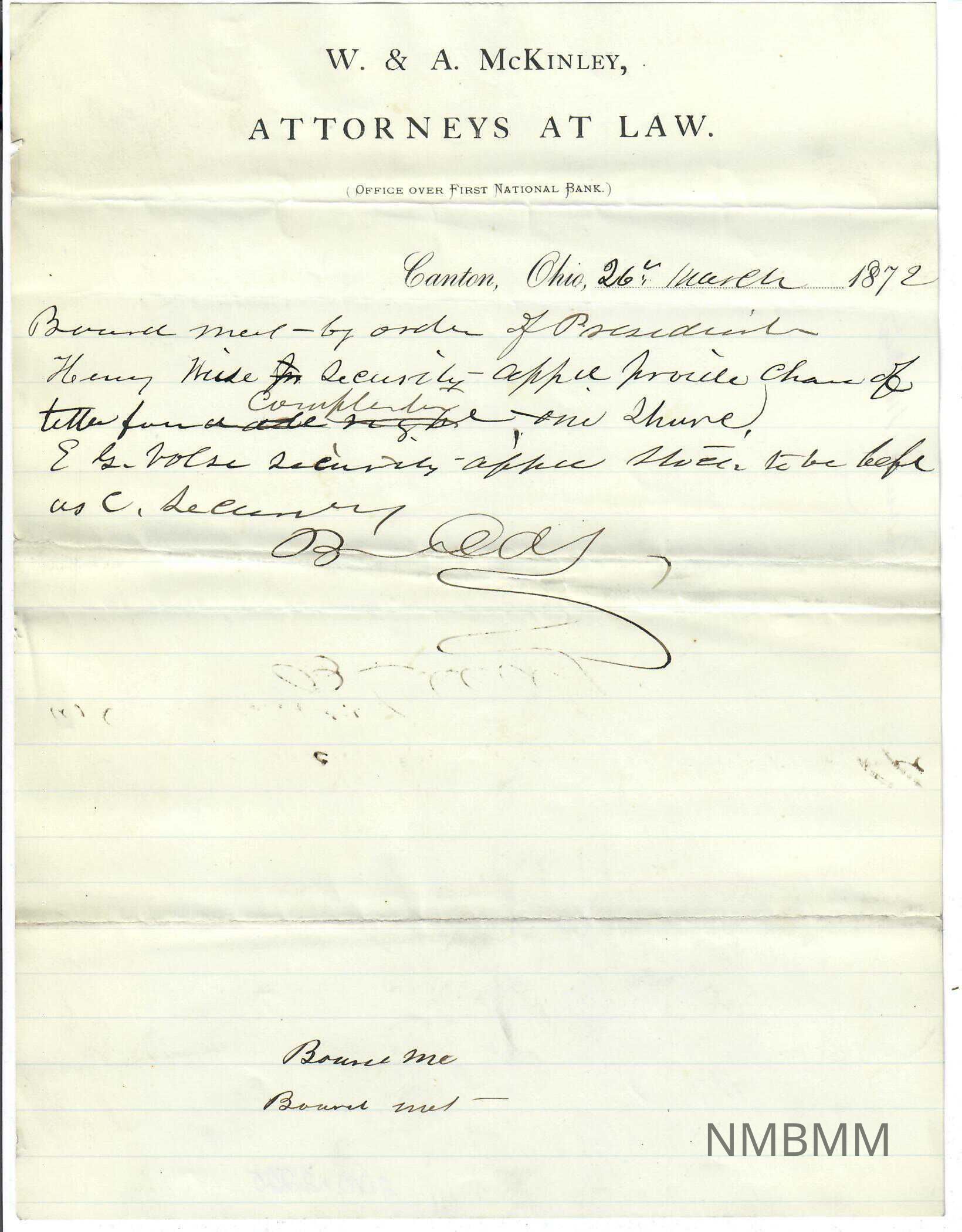 Lined Paper. Letterhead "W. & A. McKinley, Attorneys at Law. (Office over First National Bank) Canton, Ohio" Minutes discussing Board meeting ordered by the President. Folds spread vertically in thirds.Collection