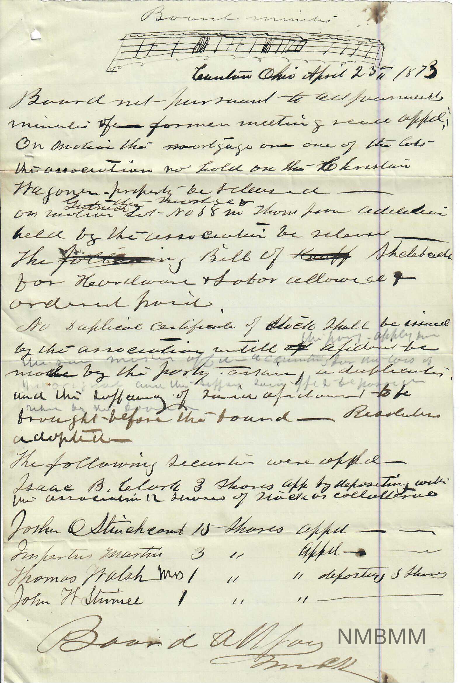 Board Minutes written in Canton, Ohio on April 23, 1873. Half way down the page some pencil notes have been written right above the pen notes which the rest of the minutes are written. there is a doodle in the top margins underneath Board Minutes. Margin is on the right hand side with a pink line on either side of it. There are stains in the top right and bottom right hand corners. There is a small whole in the top right hand corner. The paper is folded in thirds. On the back written on the side margin is "Board April 1873"Collection