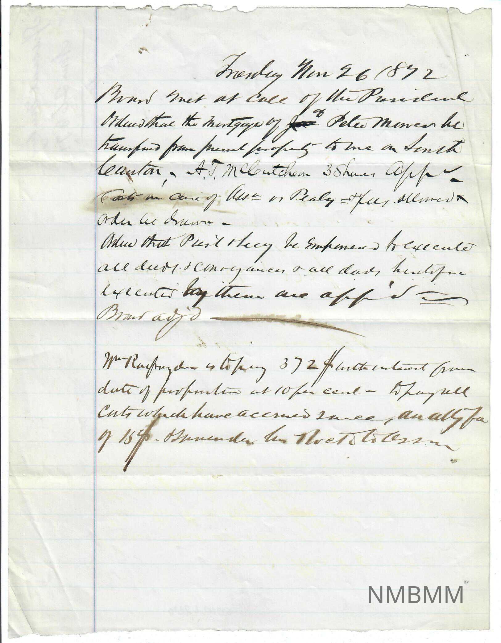 Minutes written on lined paper. Margin on left hand side with pink lines on either side of the blue line. Written in ink. Fold marks divide paper into thirds. Diagonal folds on the top and bottom right hand side corners. Some ink stains in the middle of the paper. On back is written "Special Meeting Mar. 26 1872"Collection