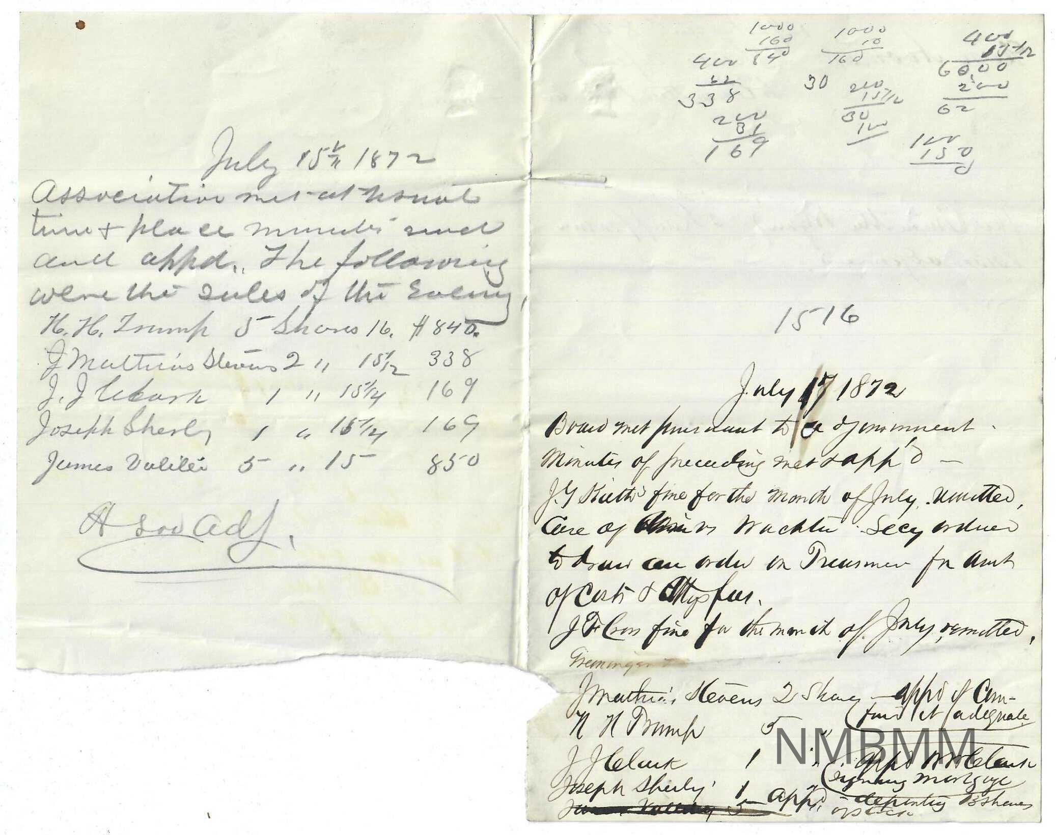 Line paper with Board Minutes written on it. Half of it is written in pen and the other pencil. There is a fold going down the middle vertically. The bottom part of the left half is torn off. On the back the ink has seeped through and there is some other staining. There is some writing on the top on the left side of the fold on the back. Some Mathamatical Calculations are on the top write corner of the front. Pen is written on the right and pencil is written on the left.Collection