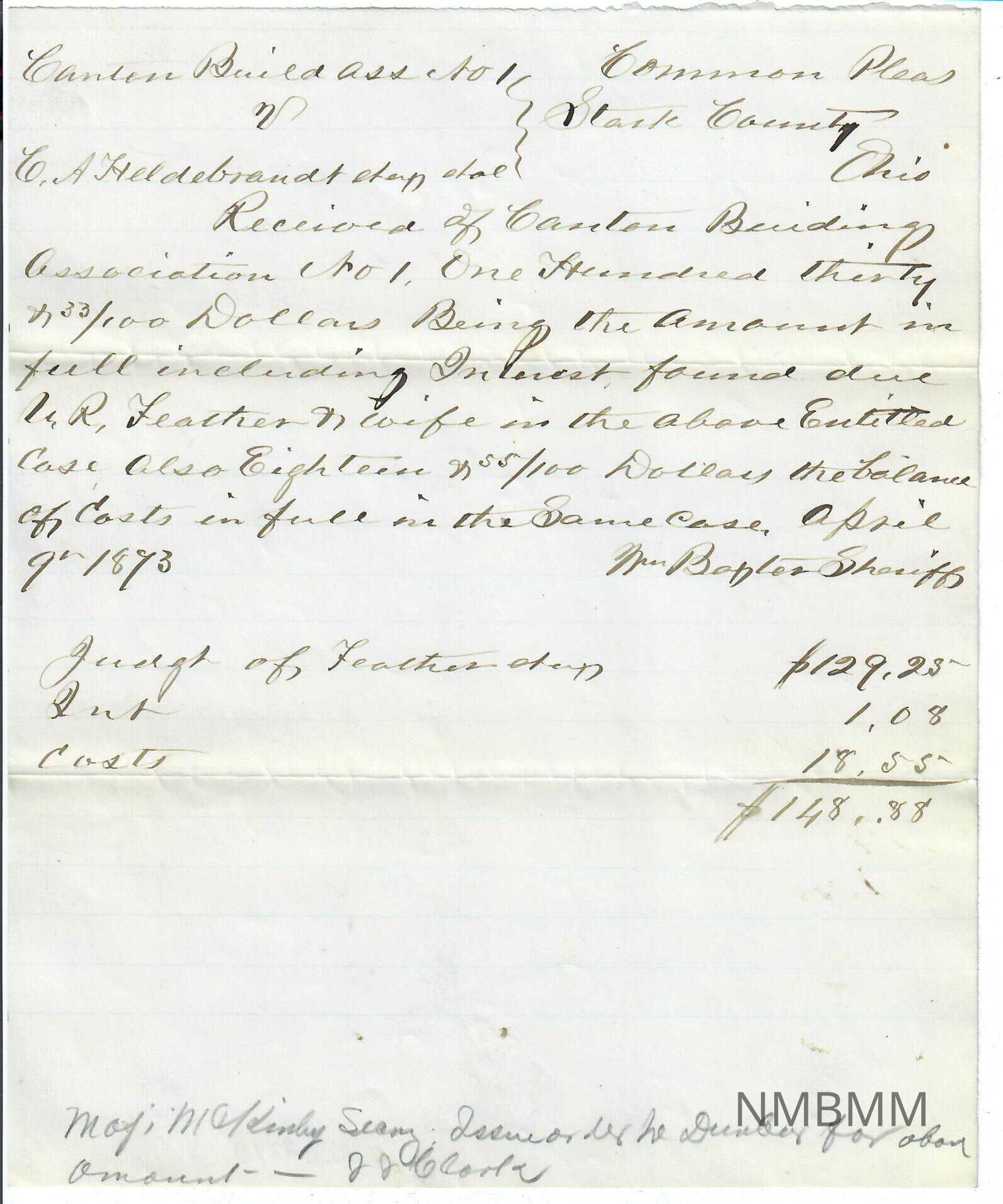 A receipt written on a half sheet of lined paper. Some various light stains are throughout on the front and back. Mostly written in ink except for a note on the bottom written in pencil. Written to Canton Building Association by Sheriff Bapter.Collection