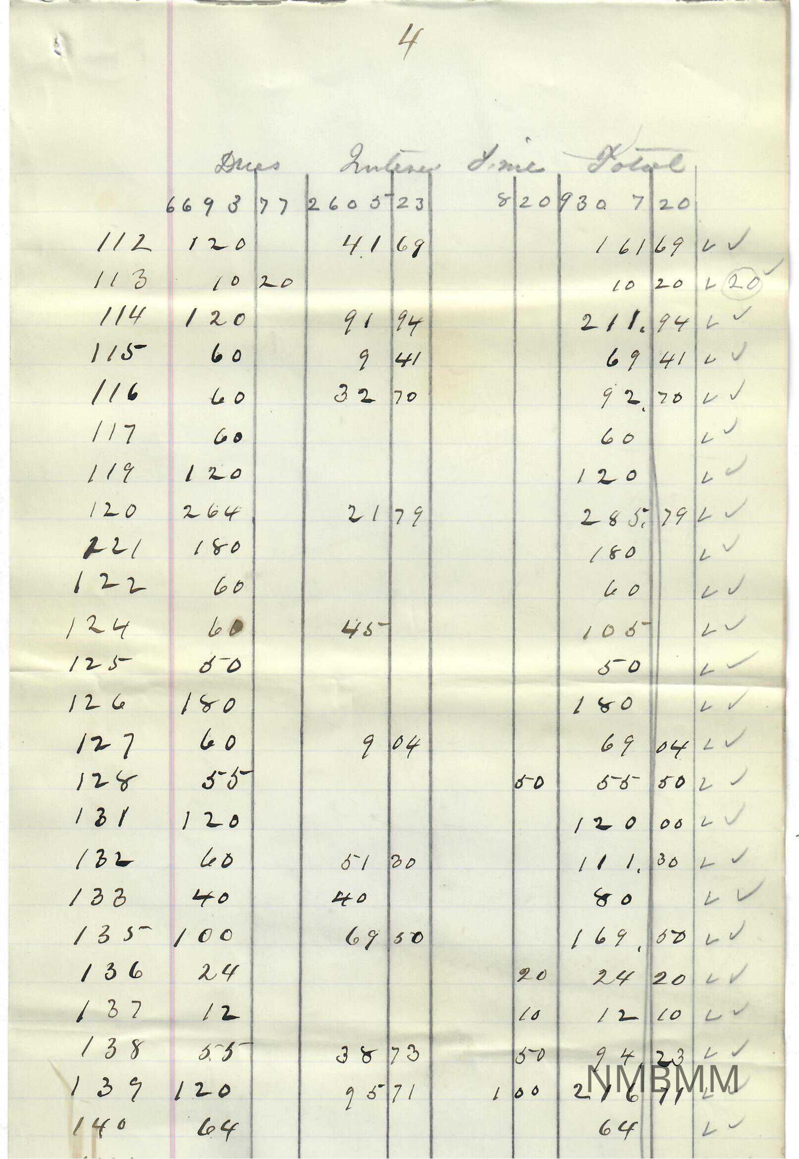 A list of dues, interests, and fines totaled up on lined paper with the margin on the left hand side with a blue line surounded by a pink line on either side. It is divided into 10 columns through the margin and pencil lines. The lines and headings are written in pencil and the numbers are written in pen. The back is blank. There is a small hole in the top right hand side where something held this with other papers together.Collection