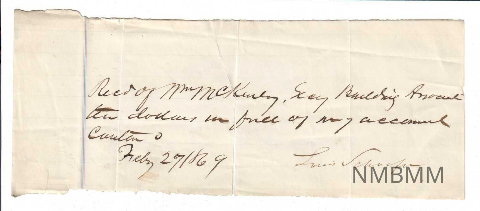 This is a hand written receipt on what appears to be a piece of ledger paper, measuring 8" x 3." The text reads as follows: "Recd of Wm McKinley, Sec"y Building Account ten dollars in full of my account Canton O Feb 27 1869 Louis Schaffer."