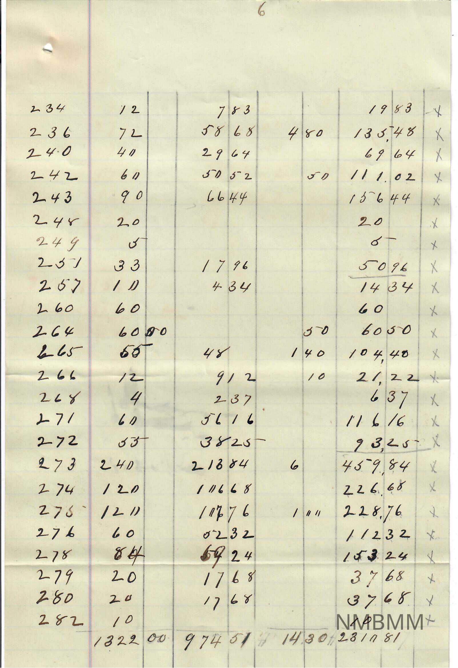 List of reciepts from January to July of 1877 written on line paper. margin on the left hand side with a blue line surrounded by a pink line on either side. The paper is divided into 10 columns with pencil lines and the margin. Written mostly in pen except some x's written in pencil. The back is blank except for some major ink stains towards the center. A small is in the top left hand corner where something held multiple papers together.