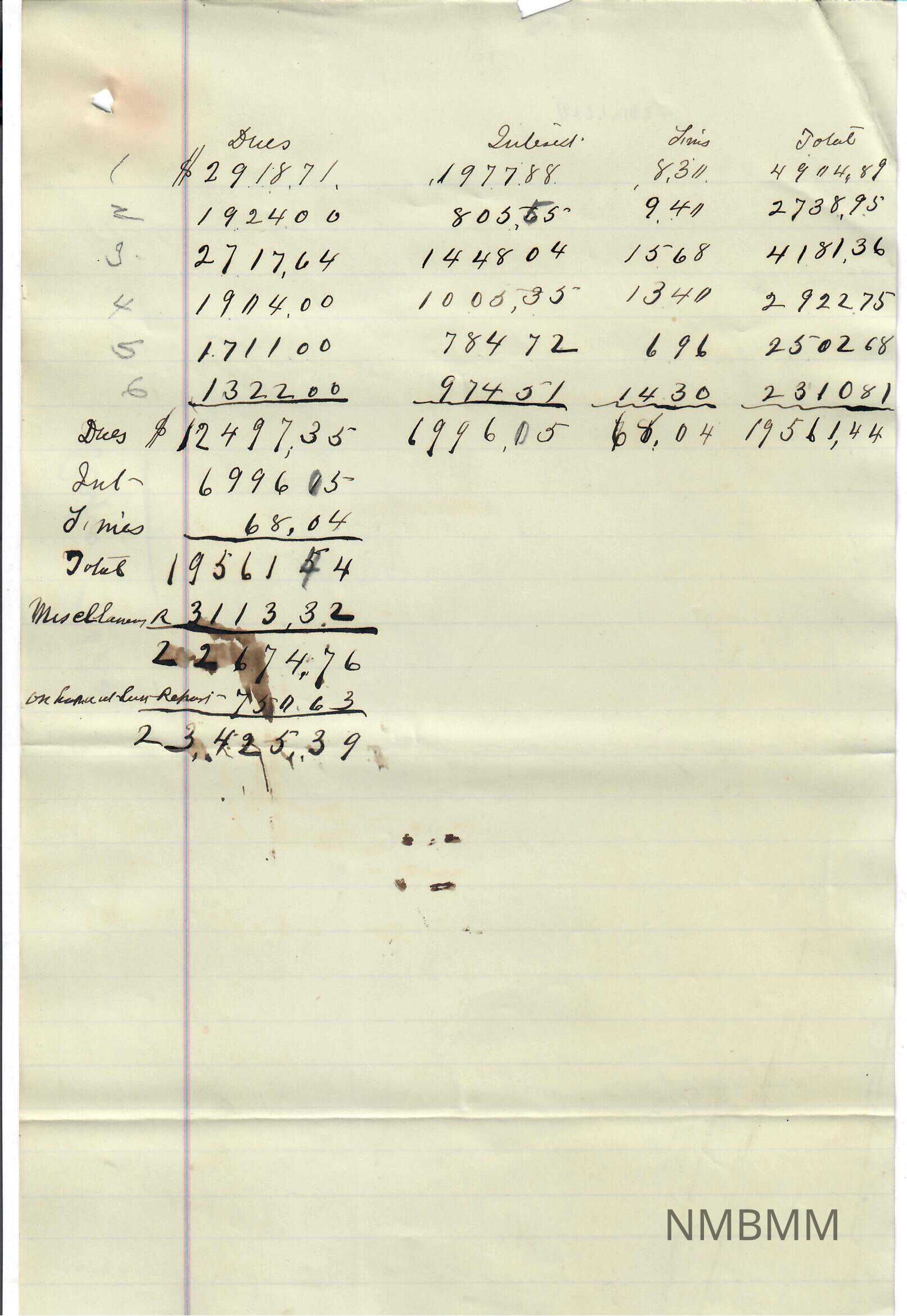 List of reciepts from January to July of 1877 written on line paper. margin on the left hand side with a blue line surrounded by a pink line on either side.It is a series of mathematical calculations in columns labeled "Dues", "Interest", "Fines", and "Total" Written mostly in pen except some numbers written in pencil. The back is blank except for some stains and "Report 1876" writte nsideways in pencil. A small is in the top left hand corner where something held multiple papers together.Collection