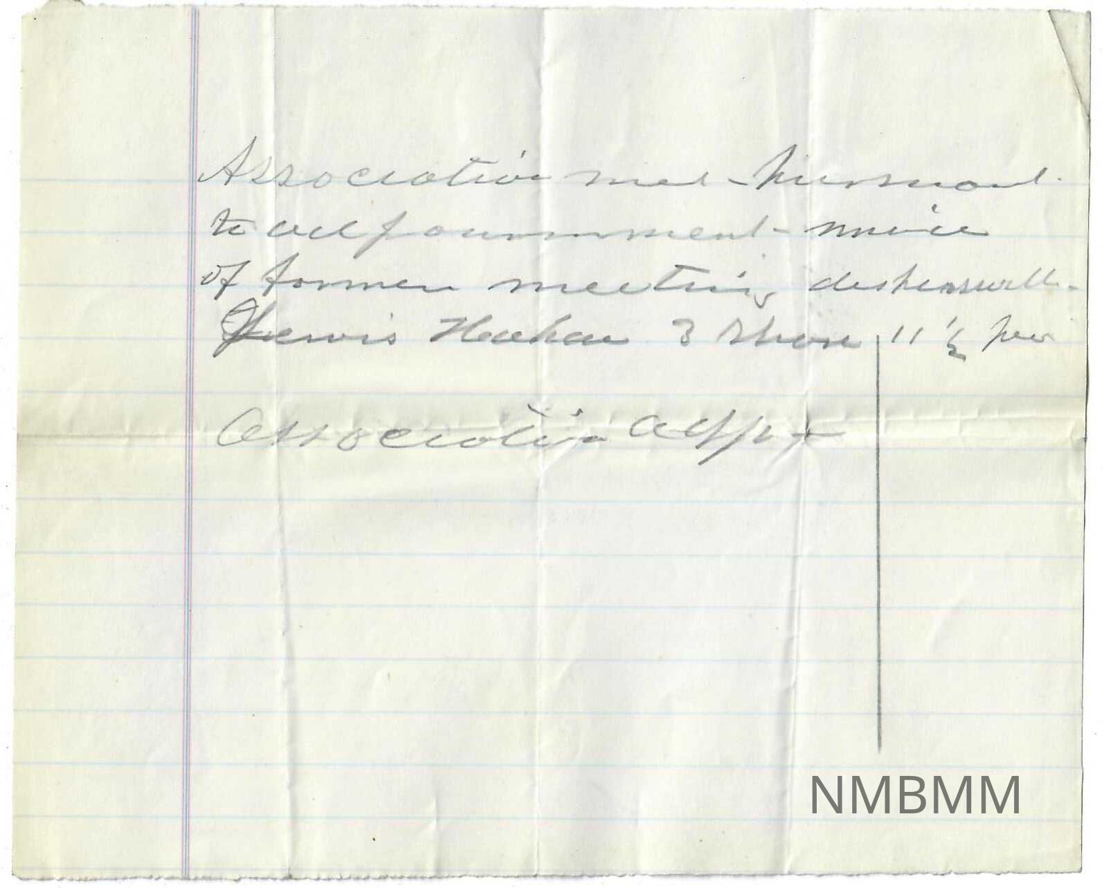 Board Minutes written on a half sheet of line paper. The margin is on the left hand side with a blue line surrounded by a pink line on either side. A fold divides the paper in half horizontally. Three folds divide the paper vertically into fourths. A small fold in the top right hand corner.Tthe back is blank.Collection