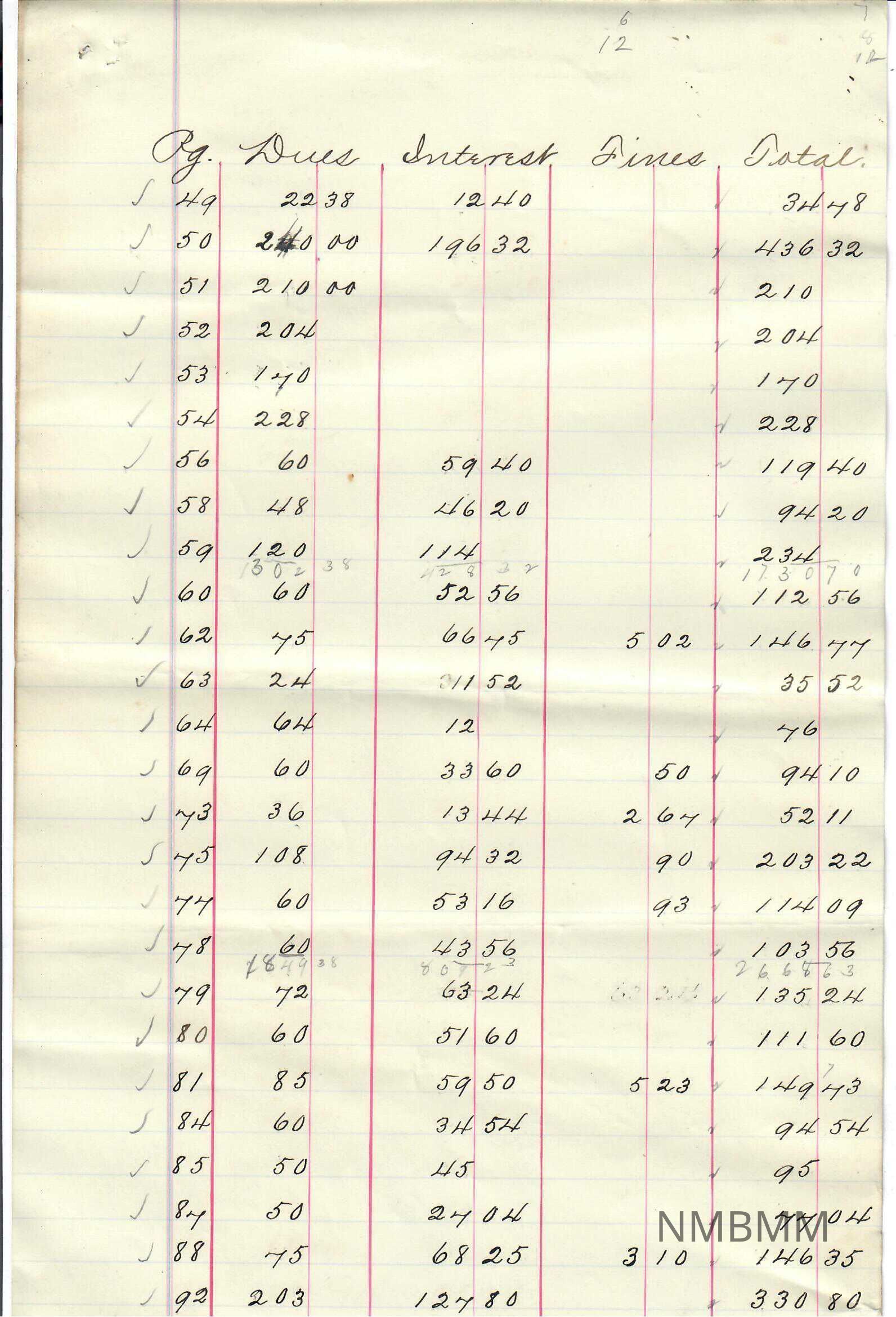 List of Receipts written on Lined paper. Margin is on left hand side with a pink line on either side of a blue line. There are nine columns dividing the paper by red pen. the titles of the columns are "Pg", "Dues", Interest", "Times", and "Total". Numbers are throughout the paper. msot of it is written in black pen ecept some pencil checkmarks written, and ren pen columns. Stains throughout. A small hole in the top right hand corner. The back is blank except for some minor stains.
