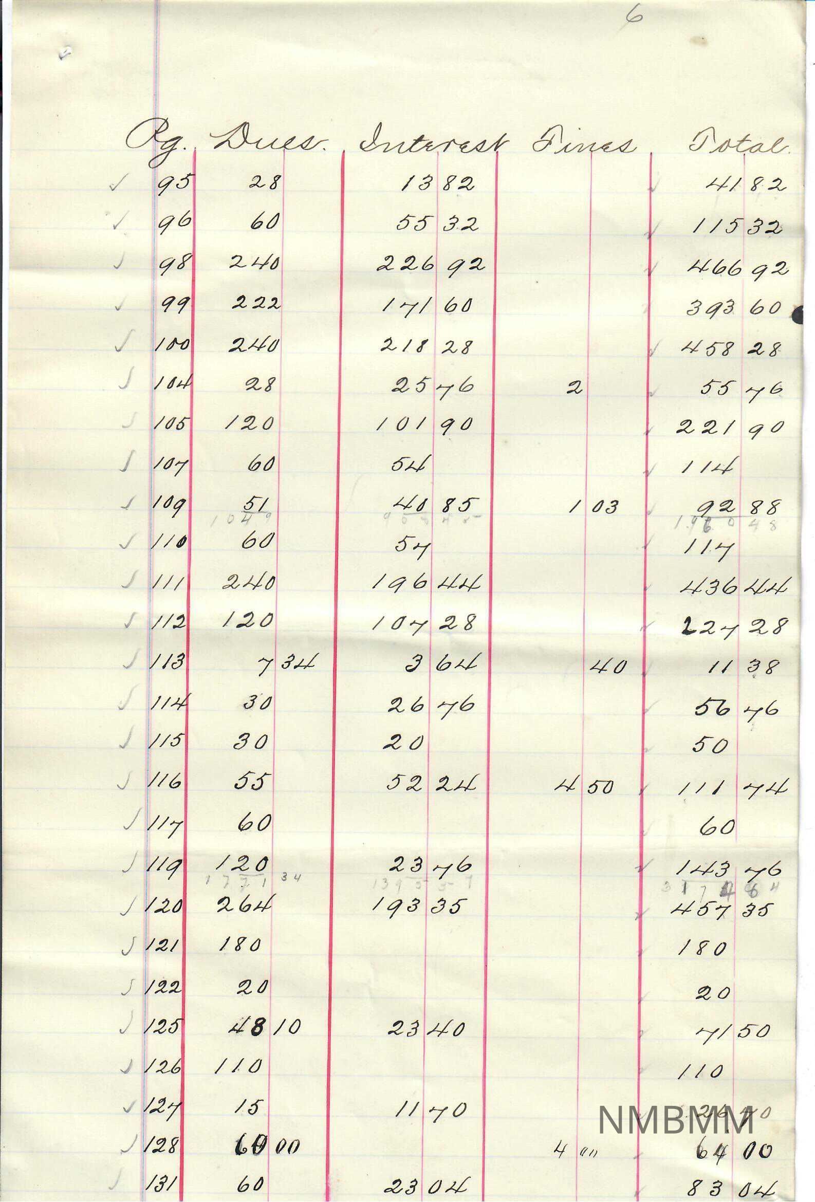 List of Receipts written on Lined paper. Margin is on left hand side with a pink line on either side of a blue line. There are nine columns dividing the paper by red pen. the titles of the columns are "Pg", "Dues", Interest", "Times", and "Total". Numbers are throughout the paper. msot of it is written in black pen ecept some pencil checkmarks written, and ren pen columns. Stains throughout. A small hole in the top right hand corner. The back is blank except for some minor stains.
