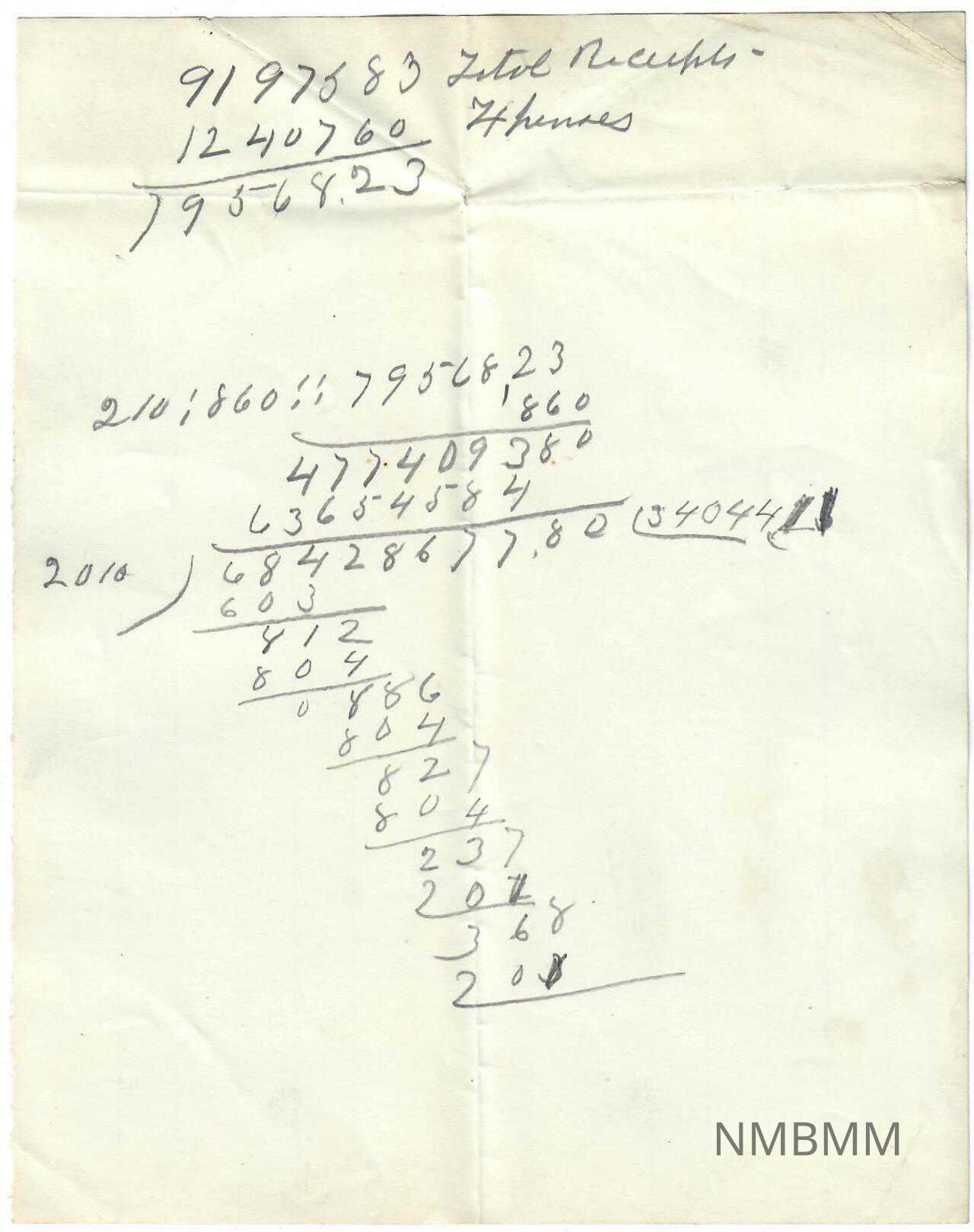 A series of calculations written on a scrap piece of line paper. Written in pencil. Stains throughout. A fold divides the paper into halves. The back has the lines the front has no lines. the back has some minor stains.