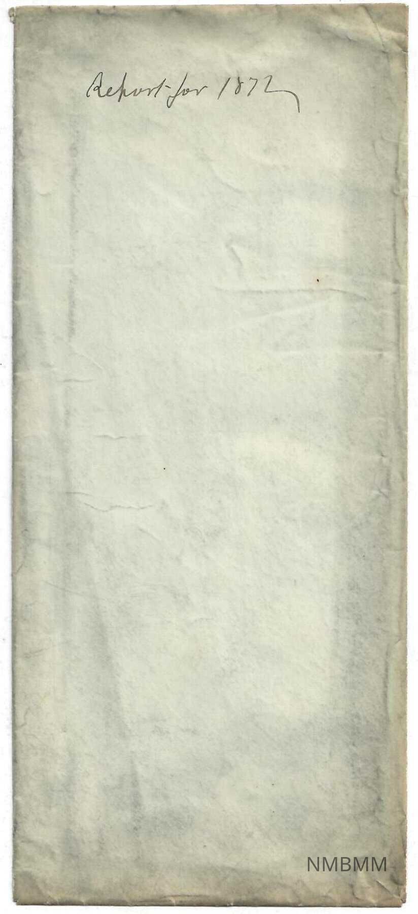 A white envelope with "Report for 1872" written sideways on the front. The envelope is opened. heavily stained throughout.