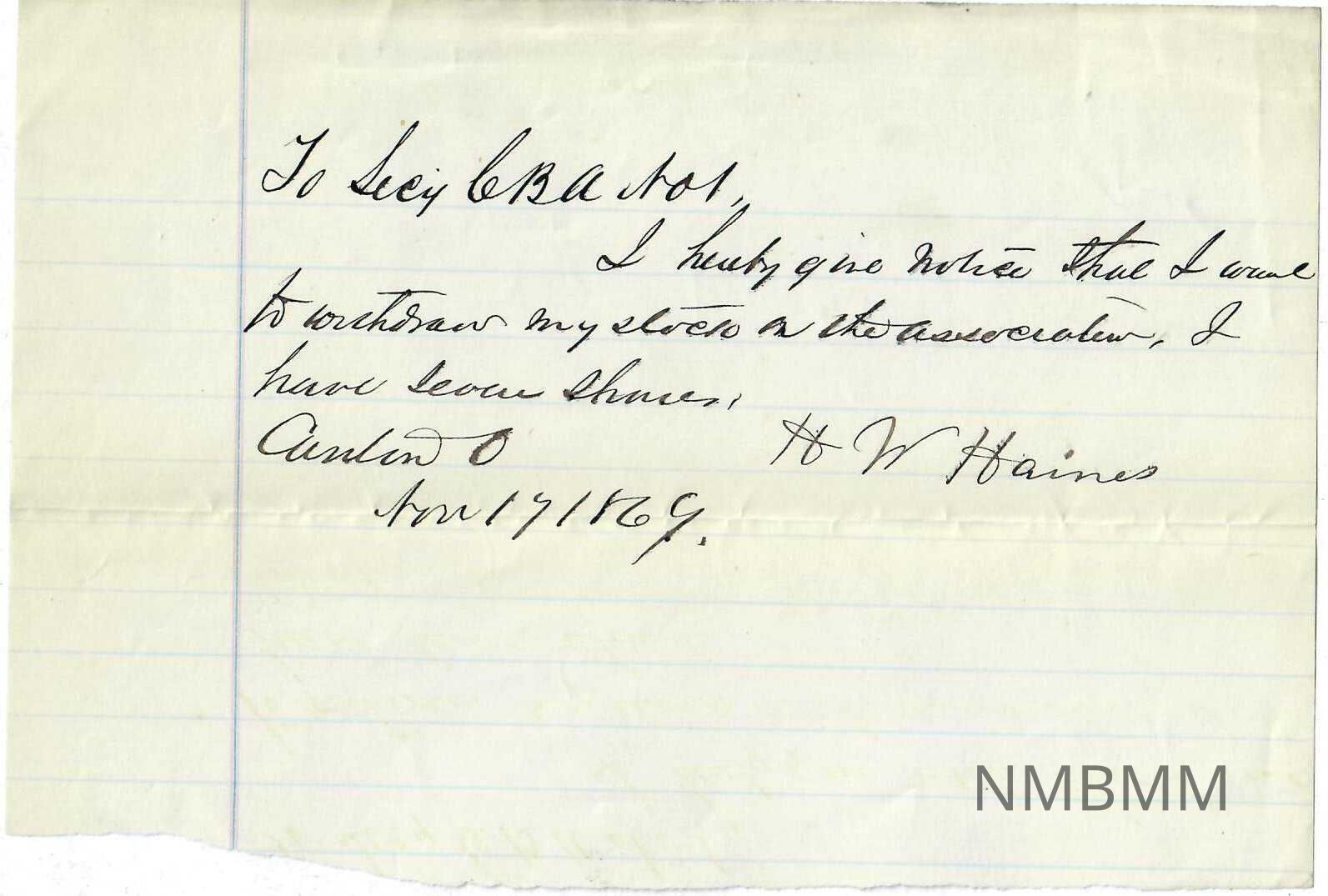Receipt from H.W. Haines written on a half sheet of line paper. Margin is on the left hand side with a blue line surrounded by a pink line on either side. Written in pen. The bottom is torn. The back is blank except for some stains. A fold divides the paper in half horizontally.Collection