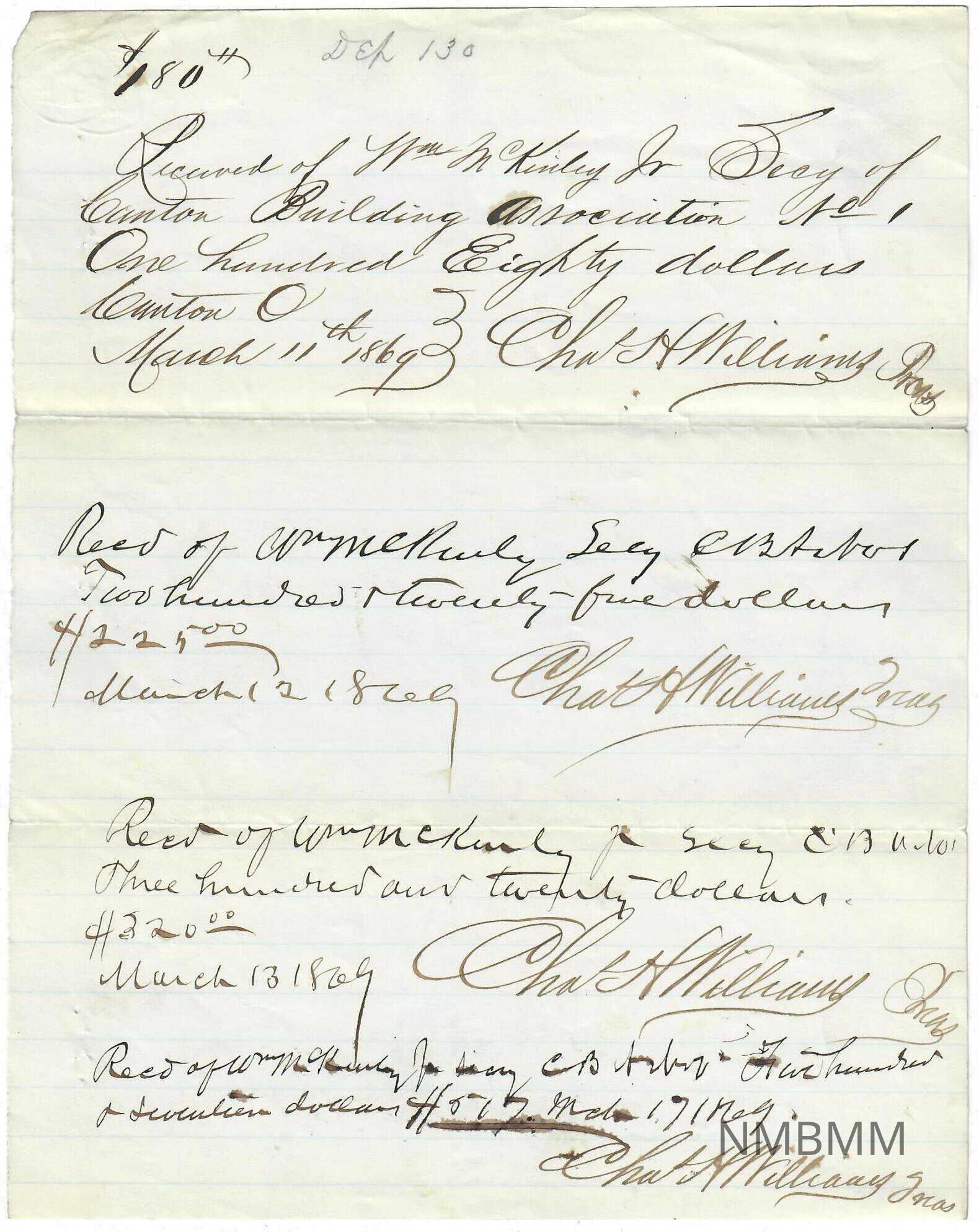 A list of 4 Receipts spanning from March 11 to March 17 of 1869 written on line paper. Stains throughout. Written in Pen. THe back is blank except for some stains. Two folds divide the paper into thirds horizontally.Collection
