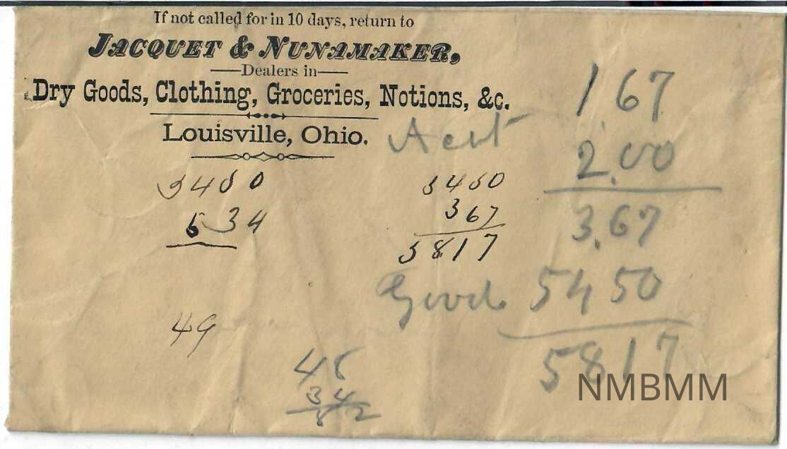 A small envelope. Printed on the envelope is "If not called for in 10 days, return to Jacquet & Nunamaker,Dealers in Dry Goods, Clothing, Groceries, Notions, &c. Louisville, Ohio." Various mathematical calculations on the front written in both pen and pencil. the Back is blank except for some stains.Collection