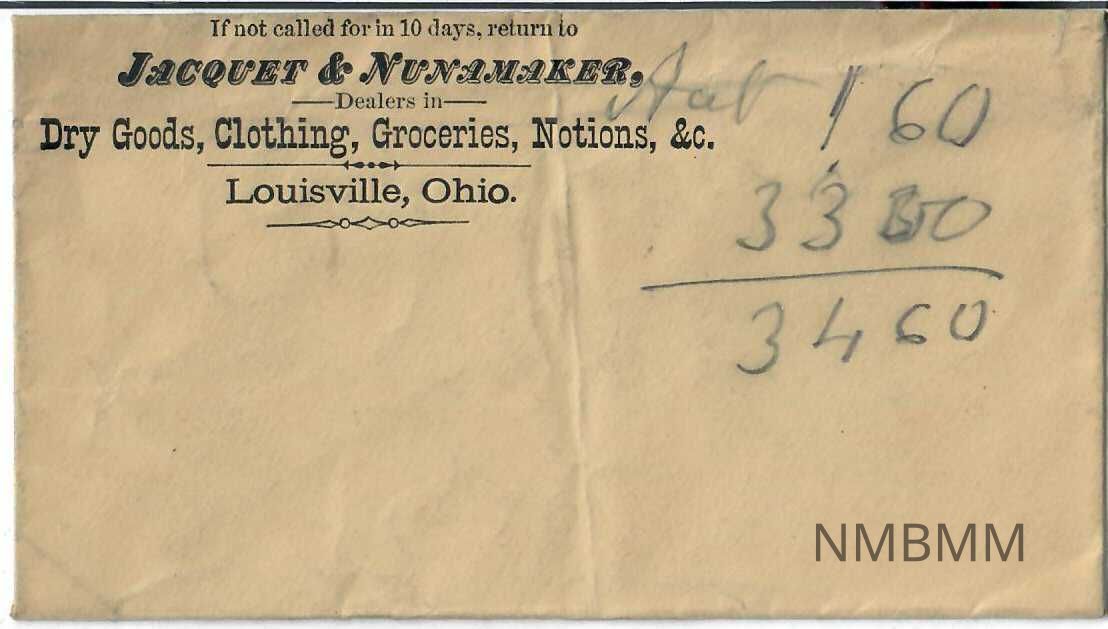 A small envelope. Printed on the envelope is "If not called for in 10 days, return to Jacquet & Nunamaker,Dealers in Dry Goods, Clothing, Groceries, Notions, &c. Louisville, Ohio." Various mathematical calculations on the front written in pencil. the Back is blank except for some stains.Collection