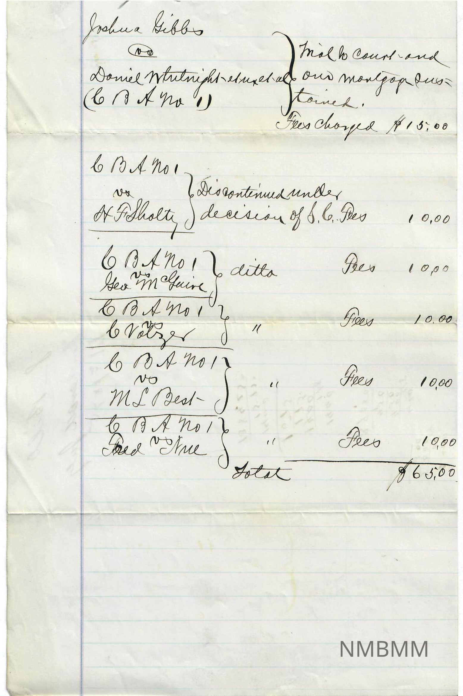 A list of expenses of court cases written on line paper. Margin on left hand side with a blue line surrounded by a pink line on either side. Written in pen. The back is heavily stained with mathematical problems written on the lower have of the sheet written in pen and pencil. Three folds divide the paper into quarters.
