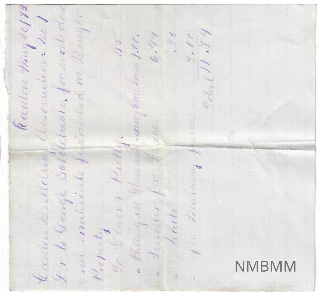 A reciept written to the Canton Building Association on a quarter sheet of line paper. Written in purple ink. A fold divides the paper in half both vertically and horizontally. The back is blank except for some stains throughout.Collection