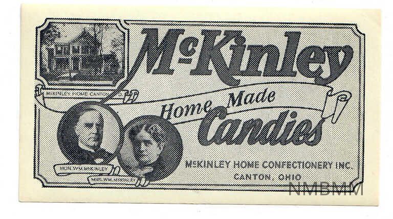 Set of seven identical labels for McKinley Home Made Candies. The front has an image of the McKinley Campaign House in Canton in the upper left corner. There are images of William and Ida McKinley in the lower right corner. The logo reads "McKinley Home Made Candies" with the words "Home Made" on a scroll across the center of the label. The words "McKinley Home Confectionery Inc. Canton, Ohio" and under the word "Candies." 1896