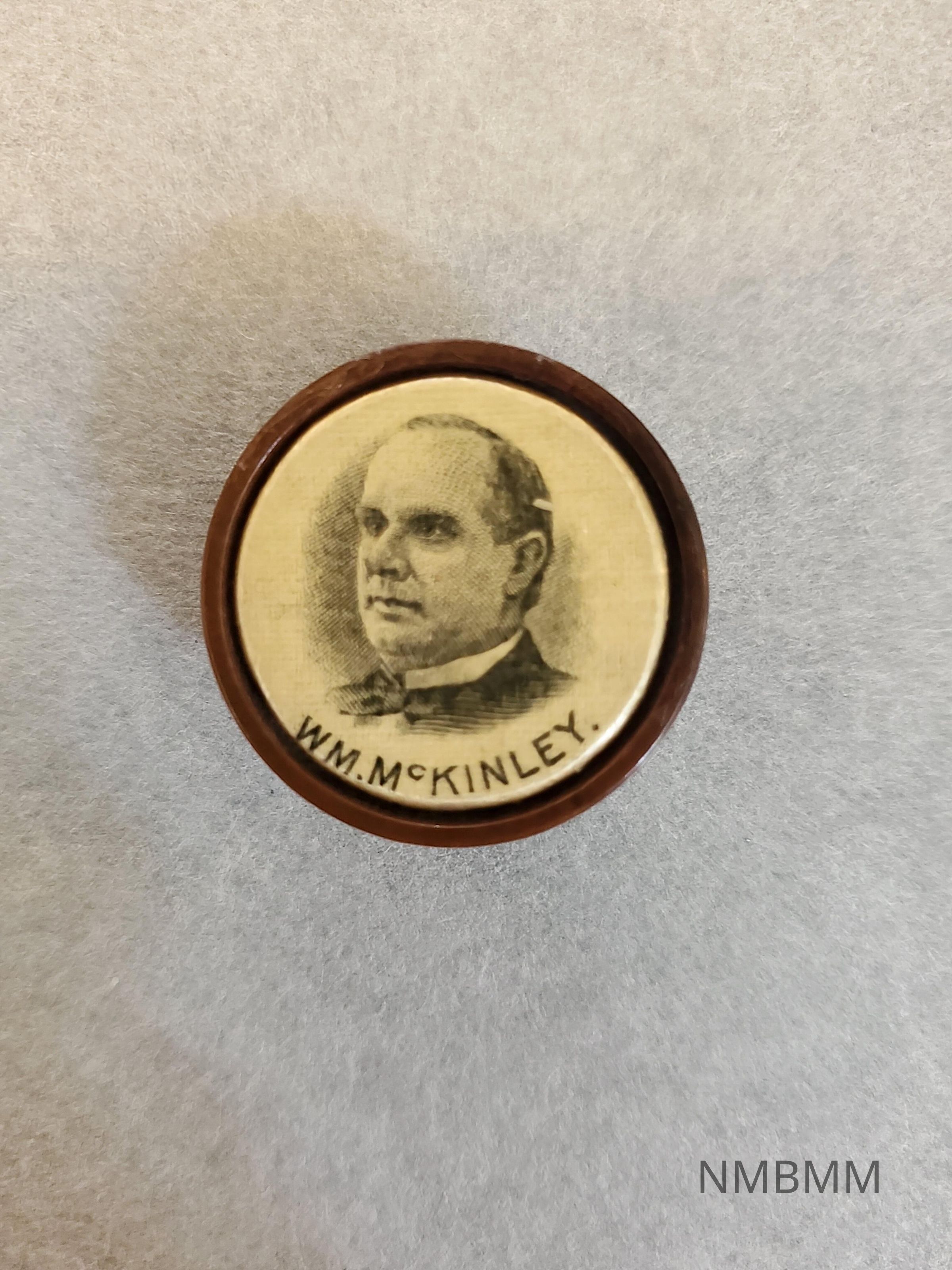 Small celluloid pin with image of William McKinley facing left. The celluloid is inset into a round bronze base. The image of McKinley is printed in blue, with the name "Wm. McKinley" beneath. The back of the pin features a tack back with a clasp.Acquisition