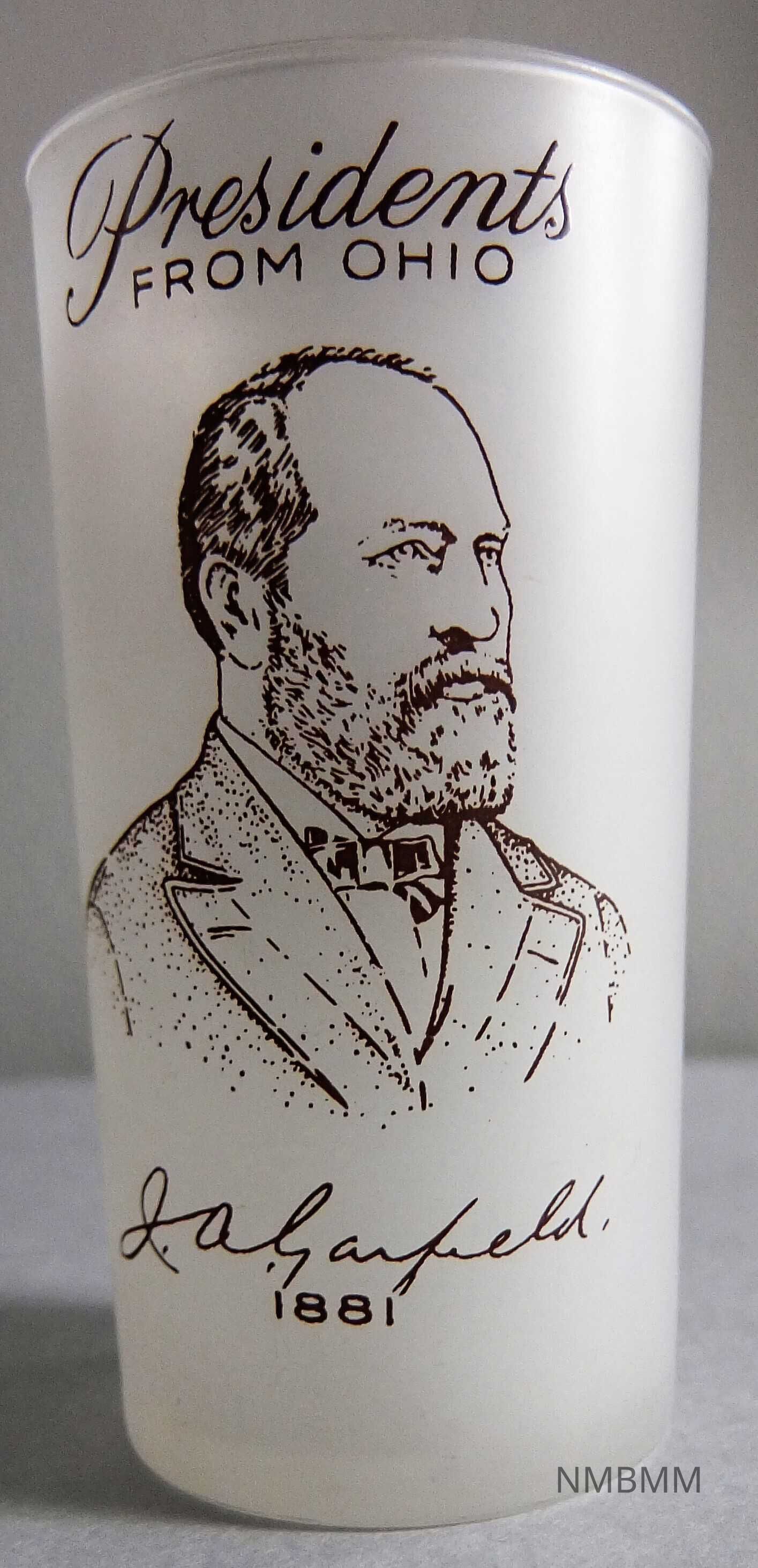 Part of the Presidents from Ohio series. ""Since the Gay Fad Studios were located in Lancaster, OH from 1945-1962, it's not surprising that Gay Fad produced numerous Ohio commemorative pieces, the most famous being the "Presidents from Ohio" tumbler set that honors the eight U.S. Presidents born in Ohio, the "Cradle of Presidents." The front of each President's frosted tumbler features his portrait, a facsimile of his signature, and his year(s) in office with "Presidents From Ohio" above, all in brown, while the back shows his birthplace in brown with colorful accents. We are proud to have found six of the eight tumblers and are diligently searching for the other two. Our set of six tumblers depict: