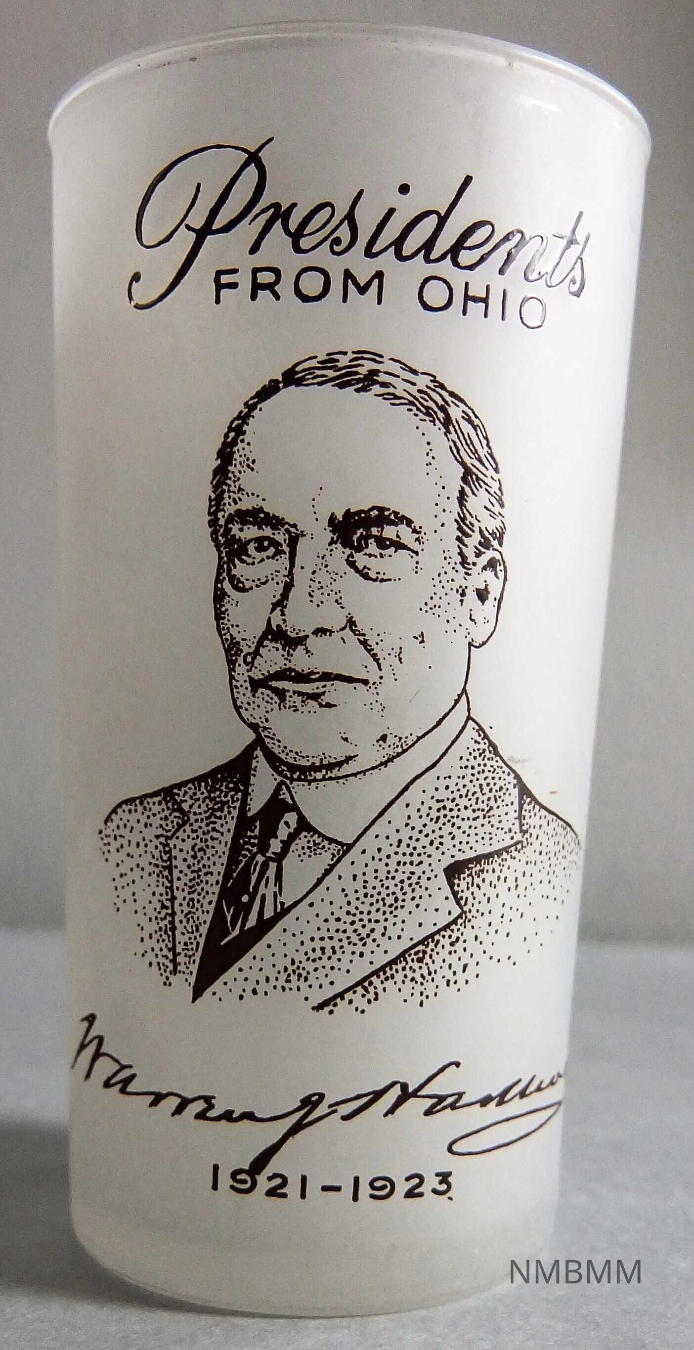 Part of the Presidents from Ohio series. ""Since the Gay Fad Studios were located in Lancaster, OH from 1945-1962, it's not surprising that Gay Fad produced numerous Ohio commemorative pieces, the most famous being the "Presidents from Ohio" tumbler set that honors the eight U.S. Presidents born in Ohio, the "Cradle of Presidents." The front of each President's frosted tumbler features his portrait, a facsimile of his signature, and his year(s) in office with "Presidents From Ohio" above, all in brown, while the back shows his birthplace in brown with colorful accents.