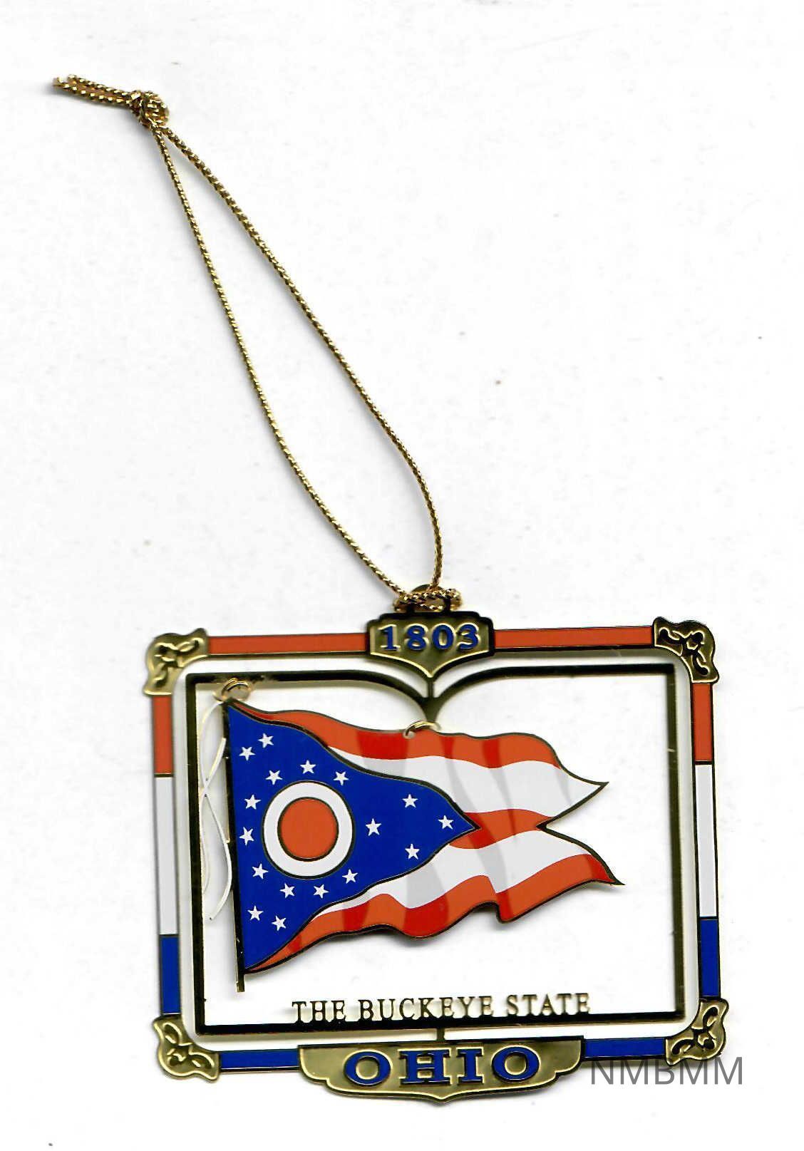 Bronze with gold plate. The state flag of Ohio is in color, surrounded by two metal frames. The back of the ornament is gold. The ornament is in a red box, lined with asmaller black box. The text on the smaller box is of black letters on a white background. The Text reads as follows: