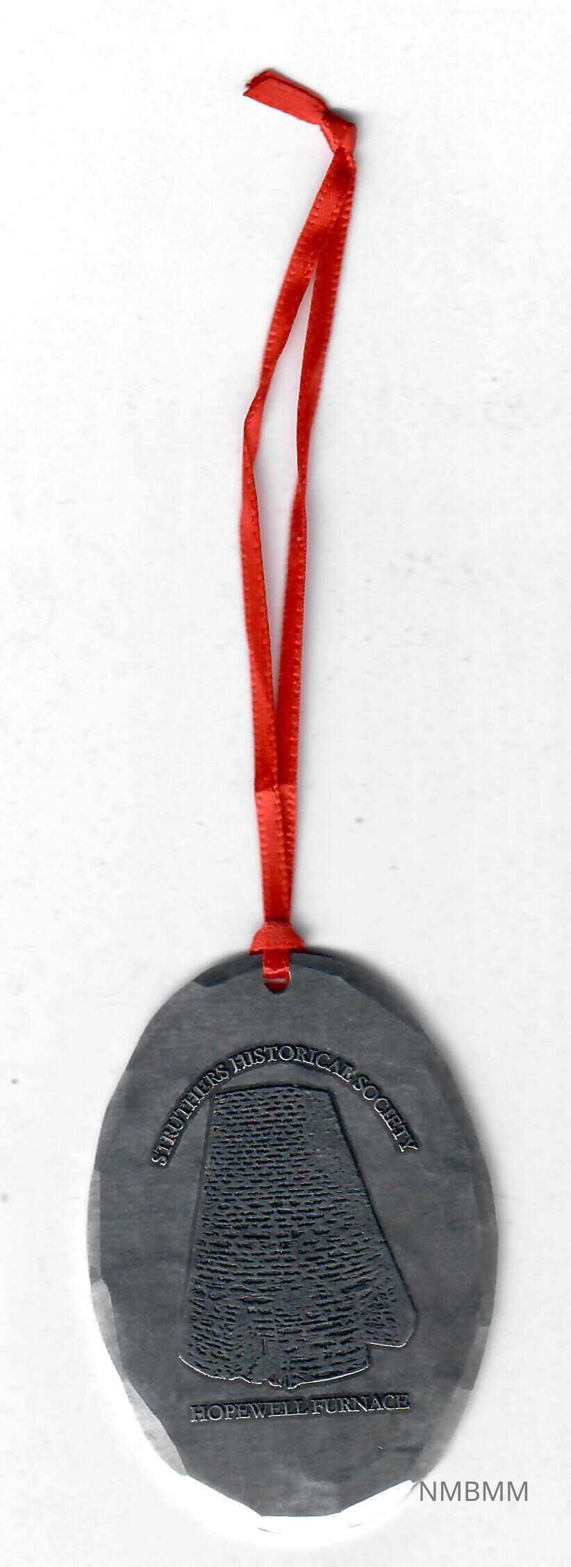 Hammered peweter oval disk. The front text reads "Struthers Historical Society Hopewell Furnace" with a sketch of the Hopewell Furnace in the center. There is a hole at the center top with a red ribbon hanging loop through it. The edges of the ornament are hammered. The back of the ornament features the Wendell August Forge logo with a small maker's mark shaped like a baseball to the right of the logo. The back also has hammer marks.Collection